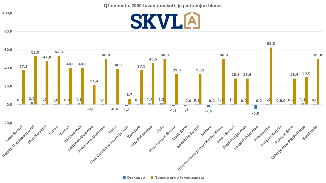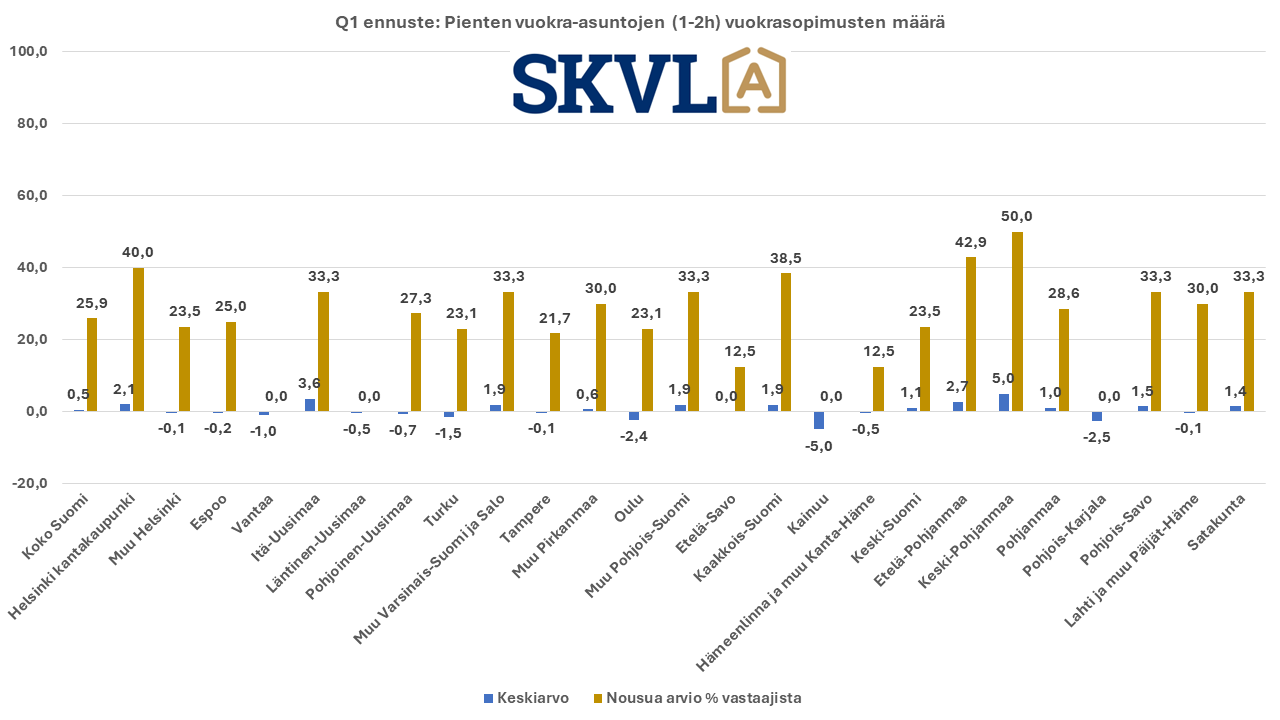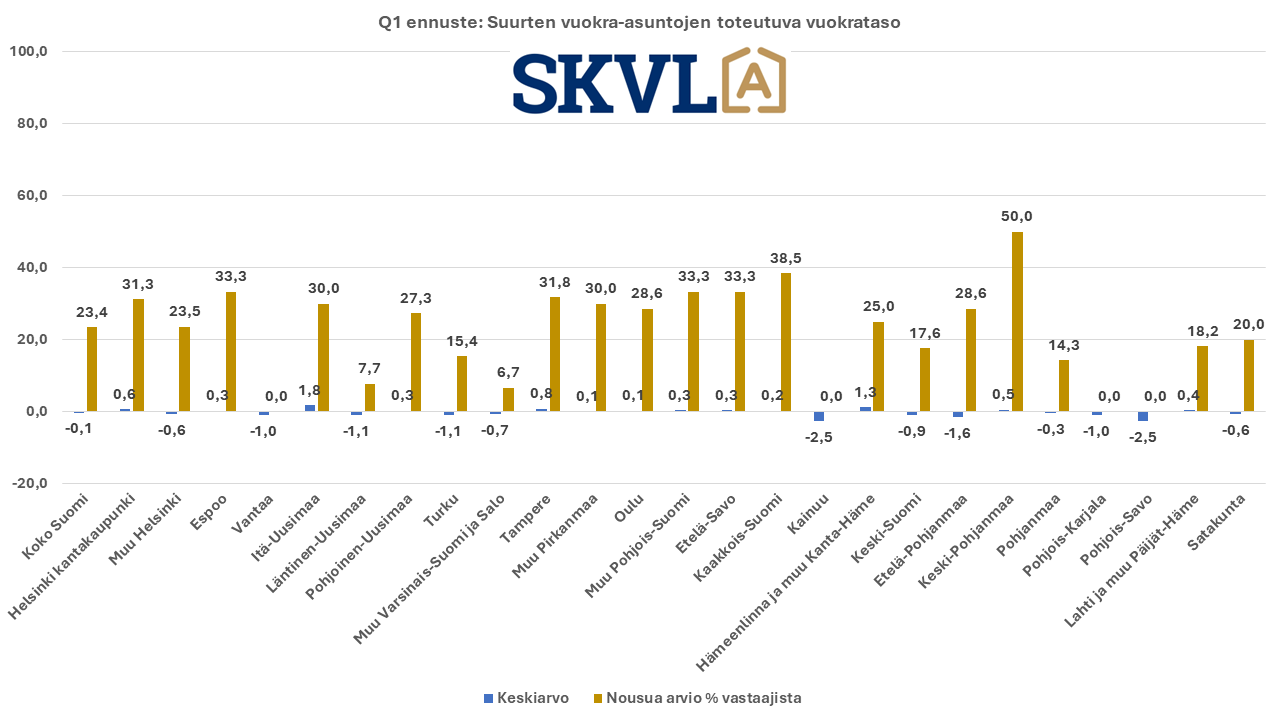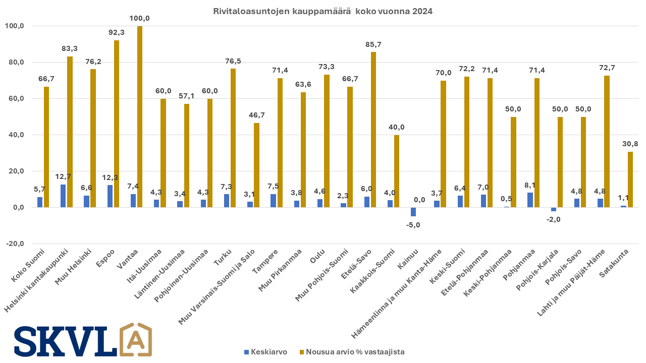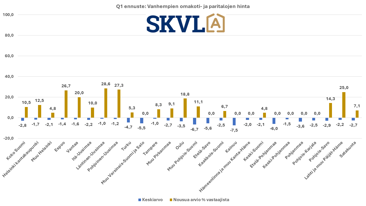 SKVL:n jäsenkunnan ammattilaisten tekemässä ennusteessa arvioidaan, että verrattuna vuoden 2023 lopun voimakkaaseen viimeiseen neljännekseen alkuvuosi 2024 tulee olemaan edelleen kasvun aikaa. Asuntojen hinnoissa ei vielä odoteta selvää nousua, mutta ei myöskään laskua. ”Nyt alkaa yli vuoden kestänyt markkinoiden suma purkautua järkevällä vauhdilla”, kommentoi SKVL:n toimitusjohtaja Jussi Mannerberg. ”Ennusteessamme näkyy nyt erityisesti perheasuntojen kysynnän jatkuva nousu”, hän jatkaa.