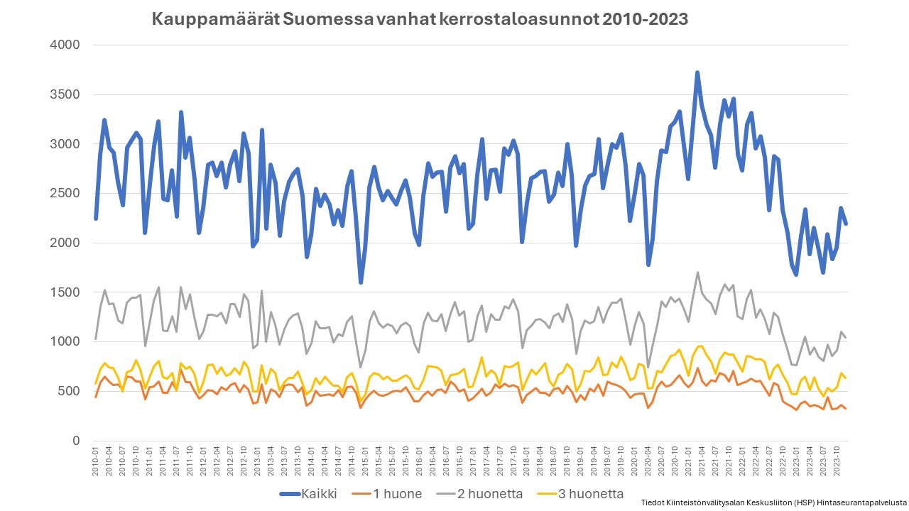 Vuoden 2023 toteutuneiden lukujen valossa voidaan nähdä, että vanhojen asuntojen kaupassa suurimmat muutokset tapahtuivat pienten asuntojen kaupassa. Kuitenkin perheasuntojen kauppa kävi keskimäärin paljon paremmin kuin moni ehkä kuvittelee. Vuoden 2023 viimeisen neljänneksen aikana myös pienten asuntojen kauppa kasvoi ensiasunnon ostajien rynnätessä kaupoille houkuttelevaan hintatasoon. Esimerkiksi pääkaupunkiseudulla niiden kauppamäärät pomppasivat merkittävästi. Myös perheasuntojen kaupassa nähtiin normalisoitumista. Hintatasossa perheasunnot pitivät pintansa yllättävän hyvin kasvukeskuksissa. Uusien asuntojen kauppojen alhaiset luvut olivat ehkä suurin syy siihen, miksi vanhojenkin kauppa hidastui niin paljon. Erityisesti sijoittajien poistuminen uudiskohdekaupasta loi ylitarjonnan. Nyt on nähty sijoittajien siirtyneen ostamaan vanhoja asuntoja.