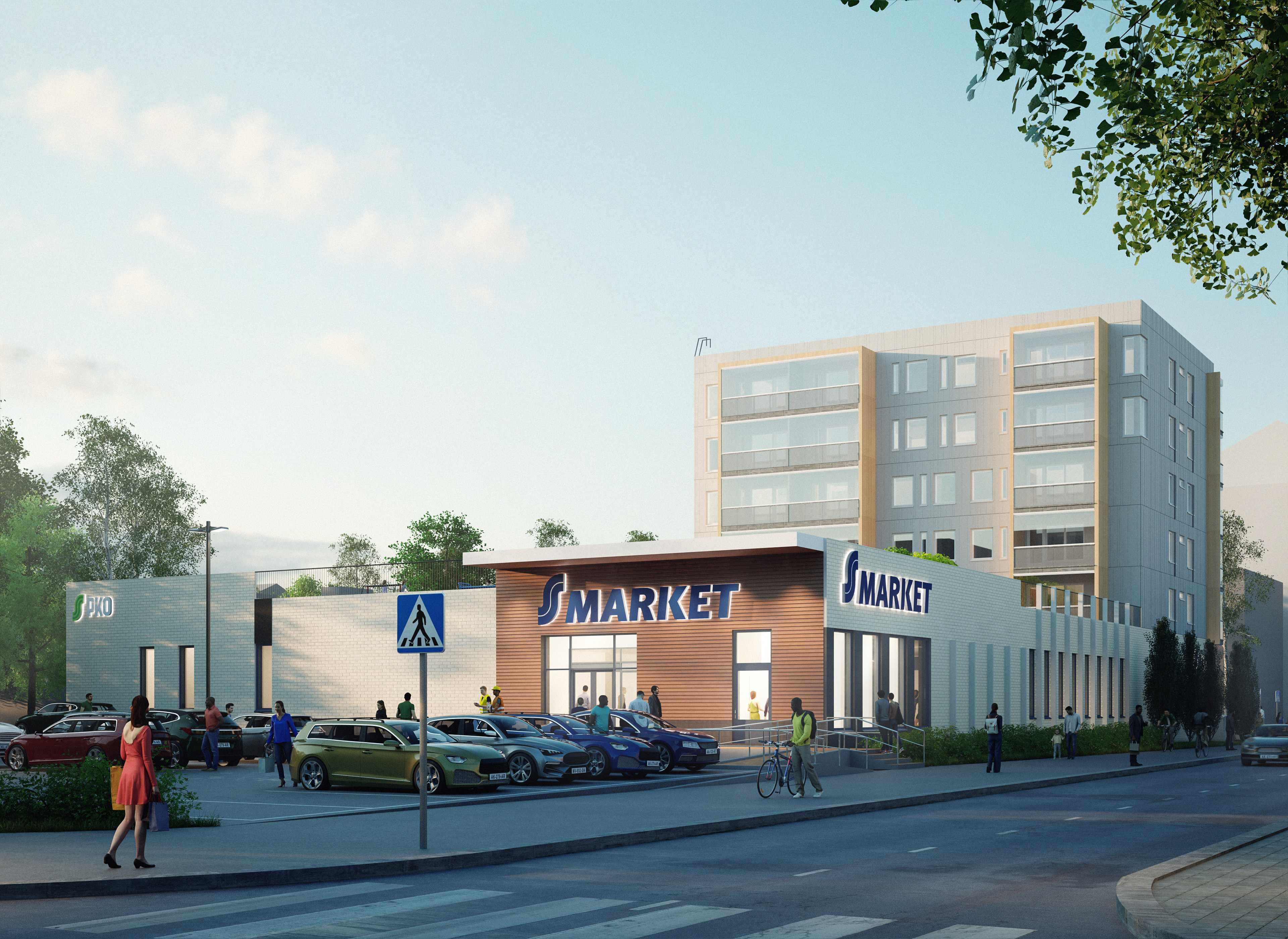 S-market, maanpäällinen pysäköintialue sekä maanalainen lämmitetty pysäköintihalli.