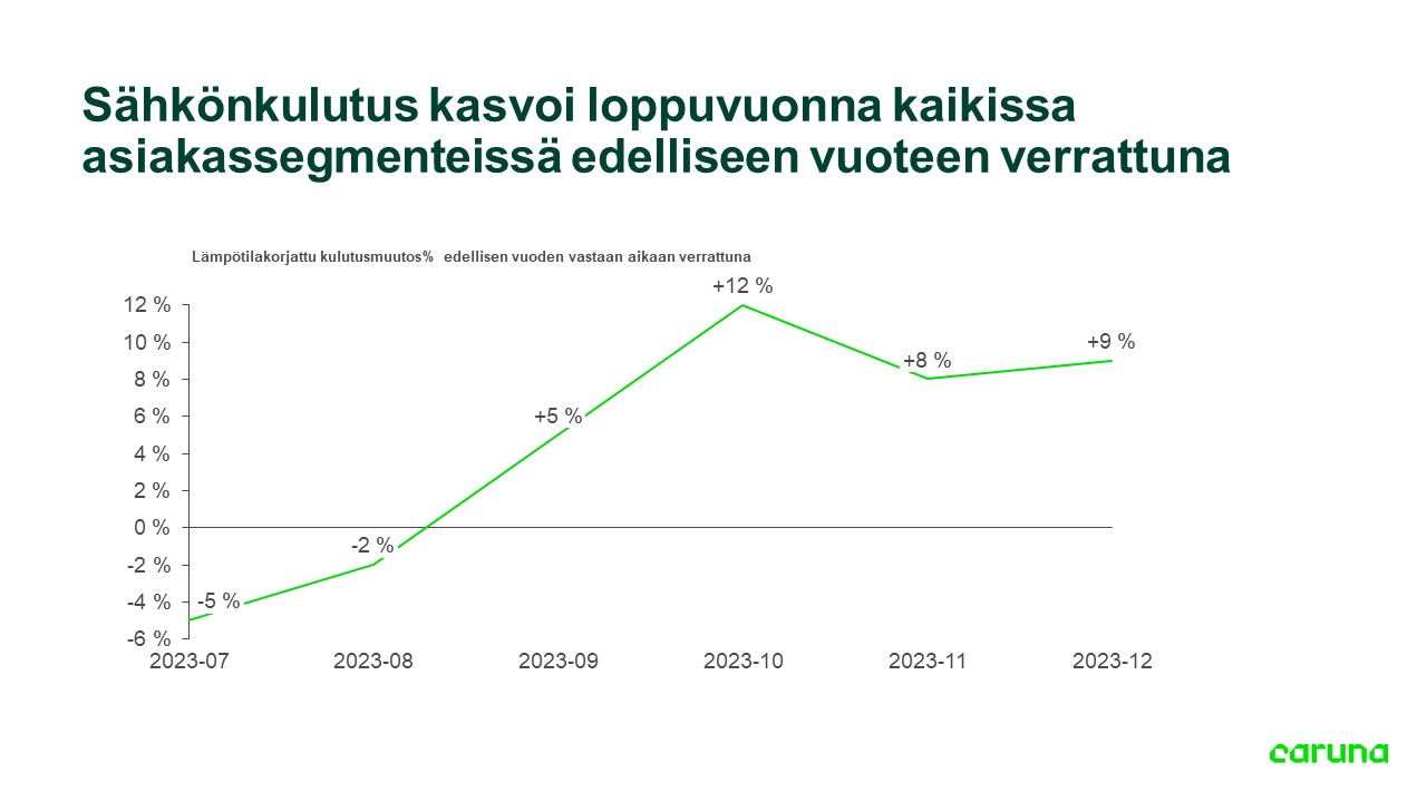 Sähkönjakeluyhtiö Carunan jakelualueen kunnat, joissa sähkönkäyttö nousi lämpötilakorjattuna eniten vuonna 2023 verrattuna edellisen vuoden joulukuuhun olivat Naantali, Närpiö ja Espoo. Naantalissa sähkönkulutuksen kasvu oli 53 %, Närpiössä 32 % ja Espoossa 22 %.