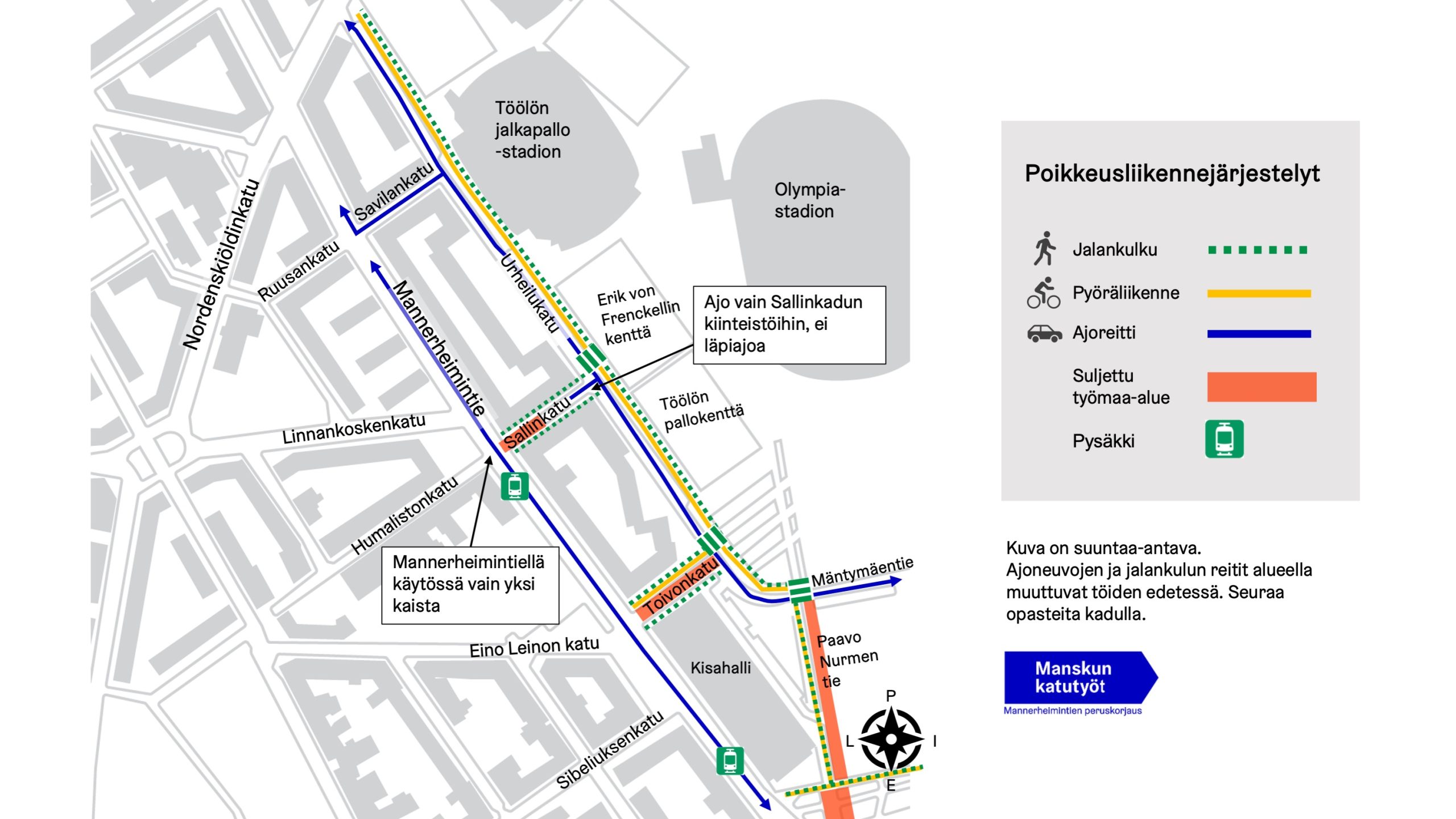 Työn ajaksi Mannerheimintie muuttuu pohjoiseen suuntaan ajettaessa noin 50 metrin matkalta yksikaistaiseksi Sallinkadun risteyksen kohdalla.