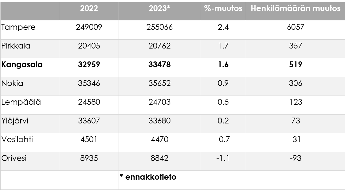 Kangasalan kaupungin väkiluku vuoden 2023 lopulla on uusimman ennakkotiedon mukaan 33 478 henkilöä. Kasvua edellisvuoden 2022 (32 959) väkilukuun on 519 henkeä eli 1,6 %. Vuonna 2023 Kangasalla ylittyi 33 000 asukkaan raja. Huima kasvu kertoo kaupungin hyvästä veto- ja pitovoimasta. Väestö jatkoi kasvua erityisesti nuoremmissa ikäryhmissä. Luonnollinen väestönlisäys Kangasalla oli -18 vuoden 2023 ennakkotiedoissa, vuonna 2022 vastaava lukema oli -12.