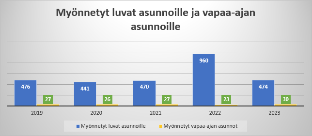 Myönnettyjen kerrostalojen määrä oli 8 kappaletta, joissa asuntoja yhteensä 345. Myönnettyjen asuntojen (sisältää uudis- ja lisärakentamisen) lukumäärä kokonaisuudessaan oli 474 kappaletta.