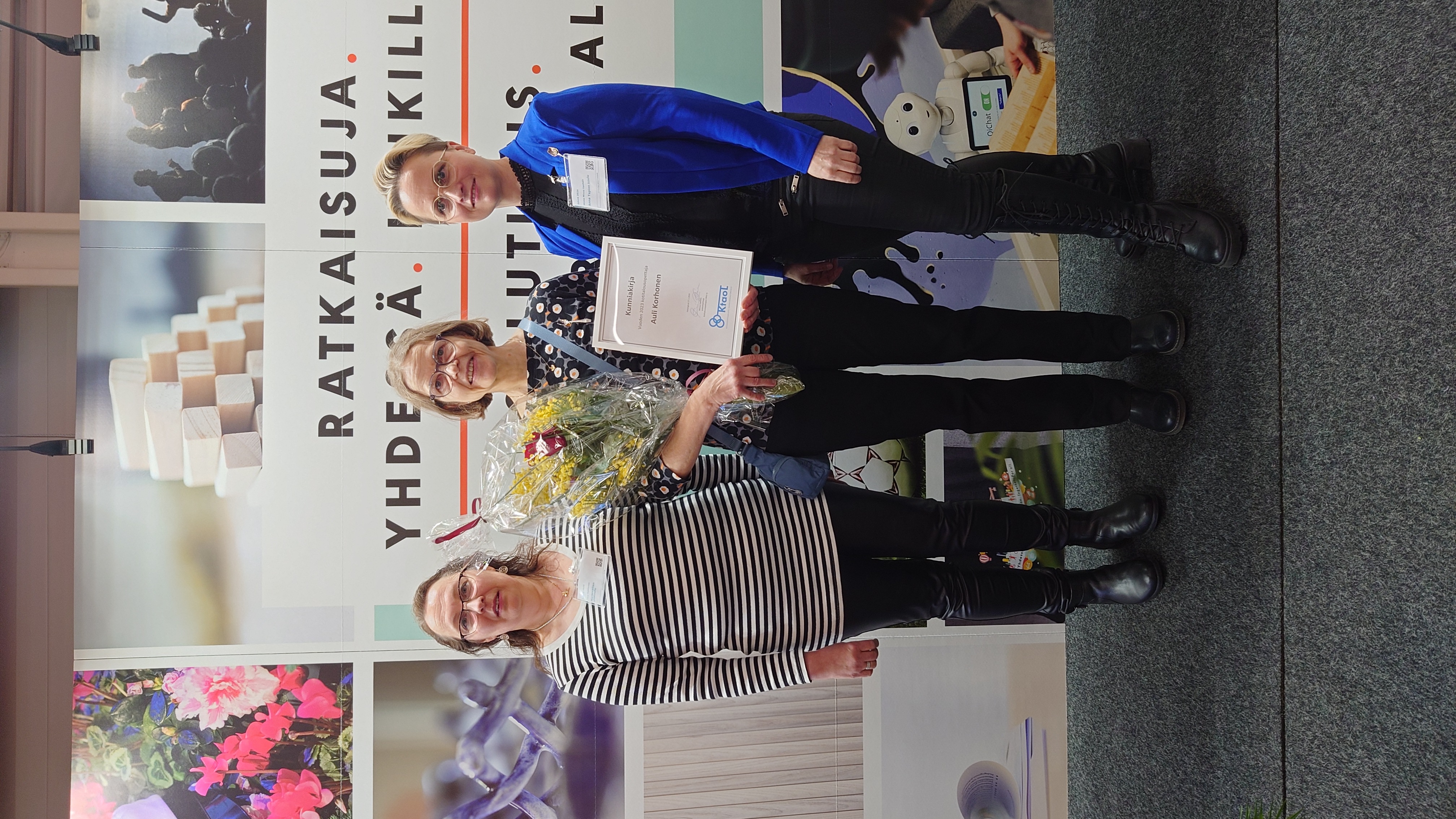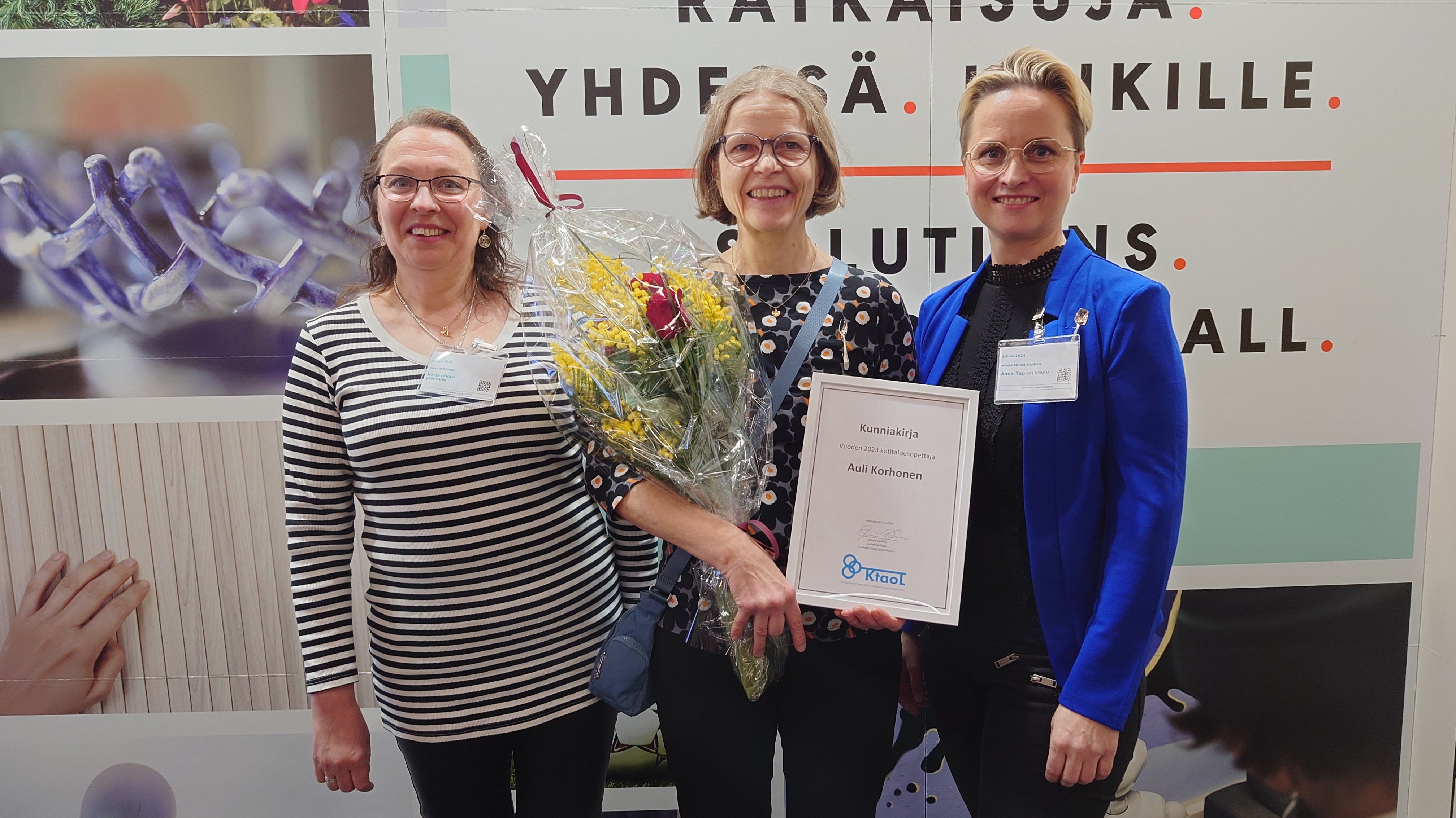 Huomionosoituksen luovuttanut Kotitalousopettajien liitto ry:n puheenjohtaja Minna Vanhala ihasteleekin sitä, kuinka Auli Korhonen on aina pystynyt näkemään ajassa olevat osaamistarpeet, ja kuinka hän on löytänyt keinot reagoida niihin.