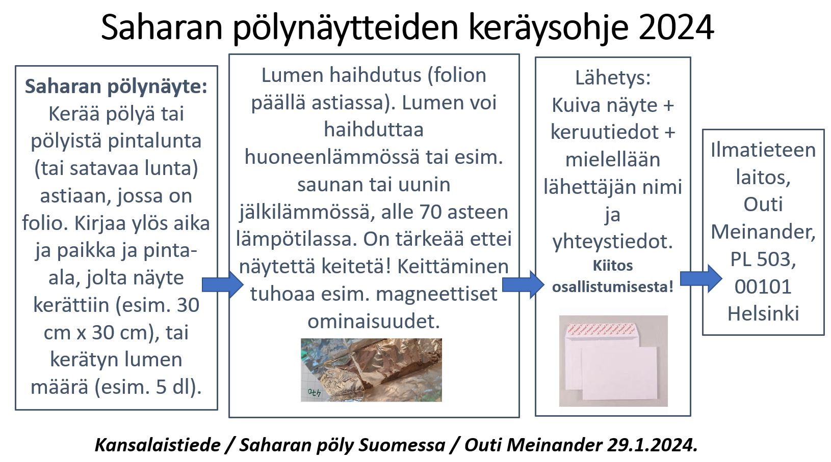 Kuiva näyte lähetetään tietojen kera Ilmatieteen laitokselle osoitteeseen: Ilmatieteen laitos, Outi Meinander, PL 503, 00101 Helsinki.
