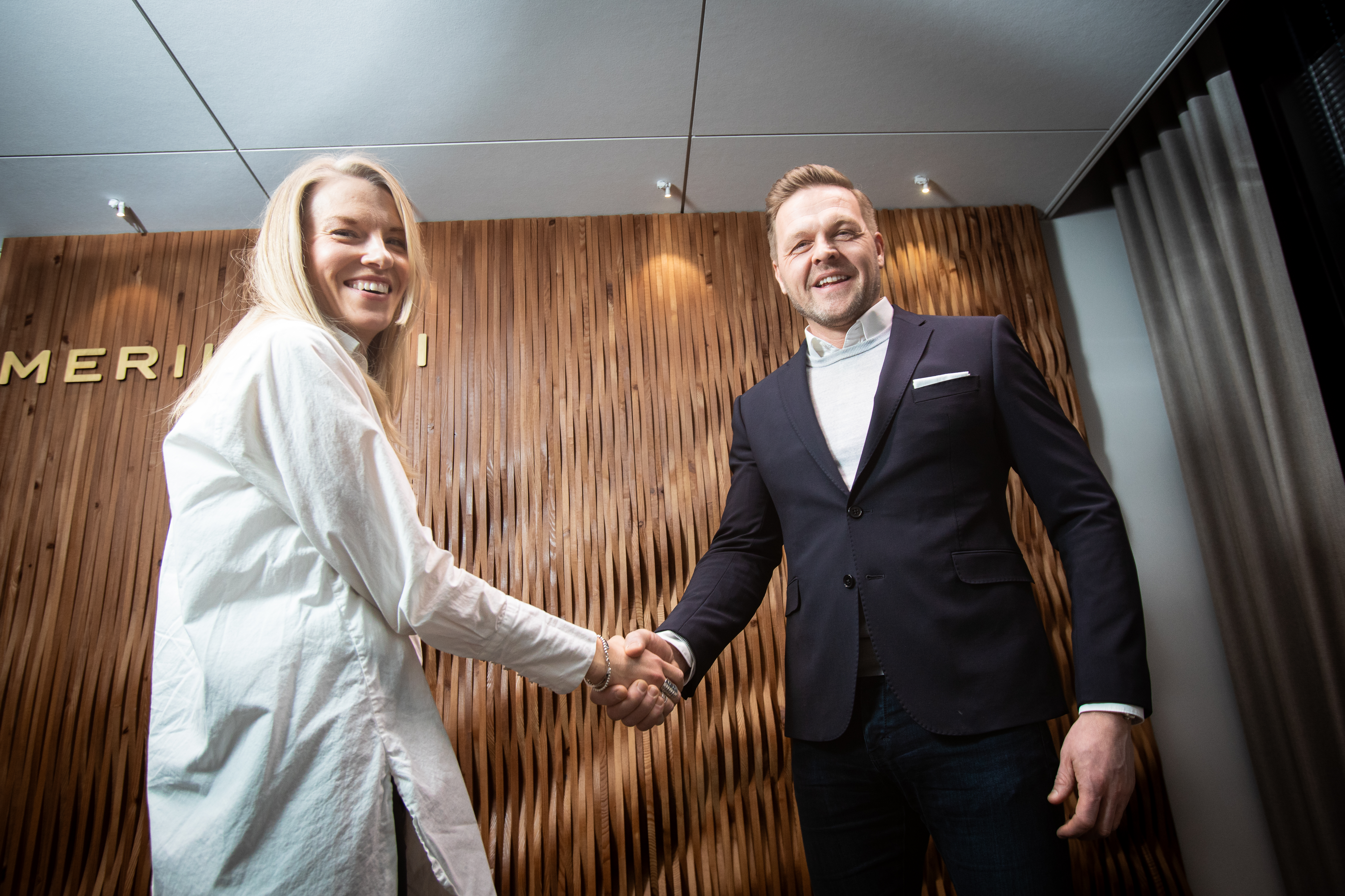 Kättä päälle. Kuvassa Dagsmarkin toimitusjohtaja Riikka Koskenohi ja Vafo Groupin johtoryhmän jäsen Timo Pärssinen.