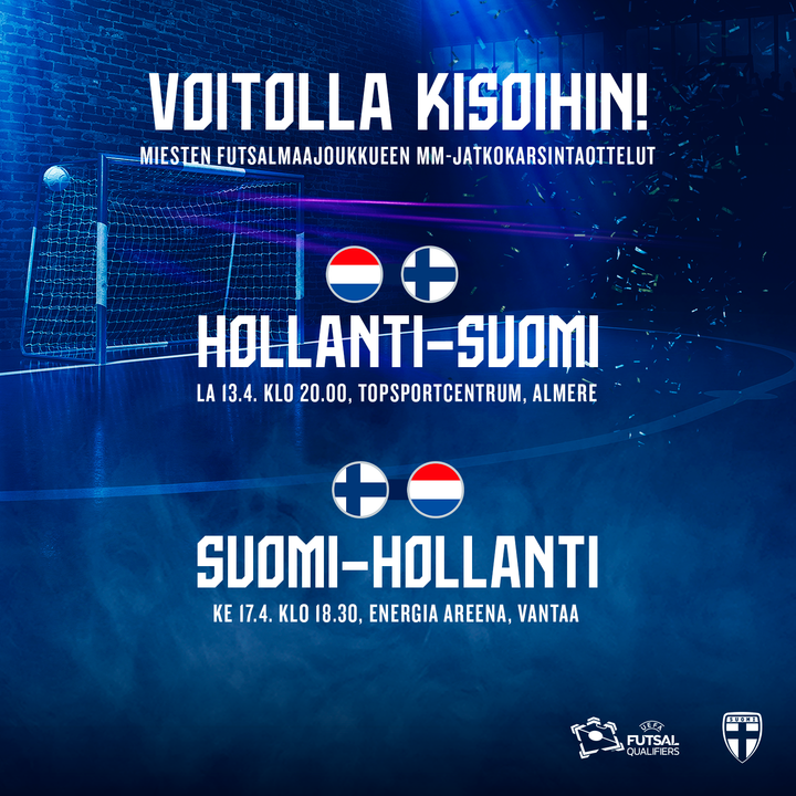 Miesten futsalmaajoukkue kohtaa MM-jatkokarsinnassa Hollannin lauantaina 13. huhtikuuta Almeressa ja 17. huhtikuuta Vantaan Energia Areenalla.
