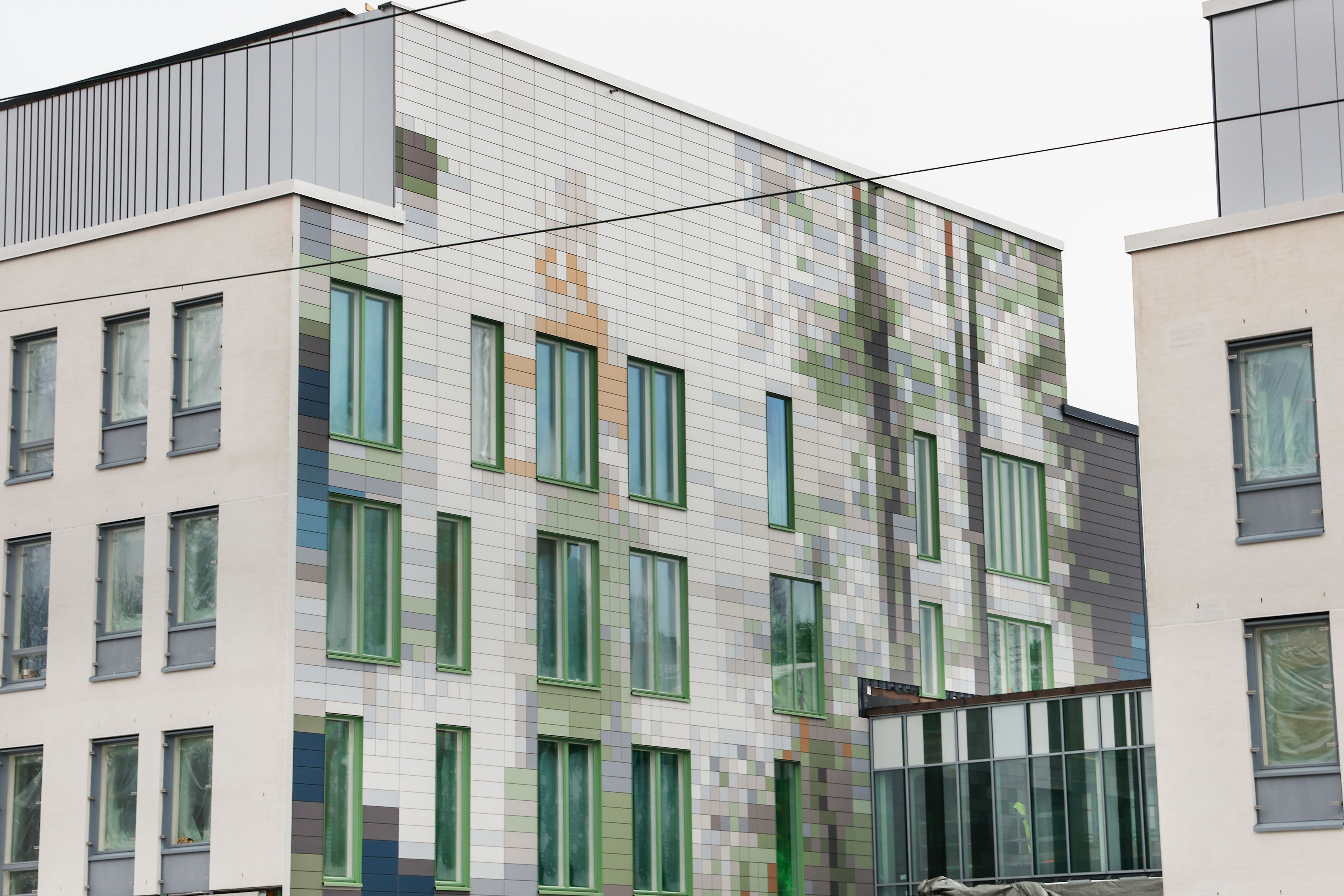 Tuula Lehtinen, känd för sina mosaikverk, vann konsttävlingen för fasaden. Hennes verk i röda, blå och gröna nyanser, det vill säga fasader som avbildar staden, havet och naturen kan redan ses längs Paciusgatan. Fasaderna som är konstnärens stil trogna består av mosaikmönster och leker med gestaltningen.