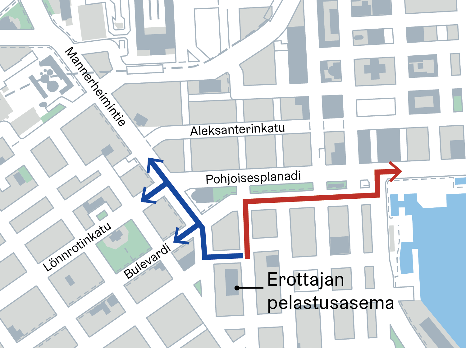 Erottajan pelastusasemalle on tammikuussa asennettu painonapit, joilla etuus voidaan käynnistää valitulle reitille. Hälytykseen lähtevän yksikön henkilöstö tilaa valoetuuden pelastusasemalta ennen ajoon lähtöään. Etuus käynnistyy noin 20 sekunnin kuluttua tilauksesta ja pitää valo-ohjauksen valitulla reitillä vihreänä ennalta säädetyn noin muutaman minuutin ajan. Liikennevaloetuusjärjestelmä on toteutettu reiteille Ludviginkatu-Erottajankatu-Mannerheimintie sekä Korkeavuorenkatu-Eteläesplanadi-Eteläranta. Reiteistä pelastusasemalla aktivoidaan se, jonka suuntaan pelastustehtävä suuntautuu. Reitillä oleva muu liikenne ehtii tieltä pois ennen kuin hälytysajoneuvo saapuu asemalta kadulle. Järjestelmästä on tulossa pysyvä.