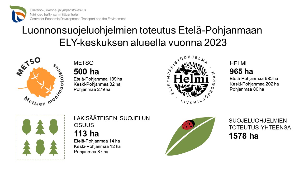 Vuoden 2023 aikana Etelä-Pohjanmaa ELY-keskus toteutti yhteensä noin 1578 hehtaaria erilaisia suojelualueita Etelä- ja Keski-Pohjanmaan sekä Pohjanmaan maakunnissa. Hankintarahaa maakuntiin ohjautui yhteensä noin 2 941 000 euroa.