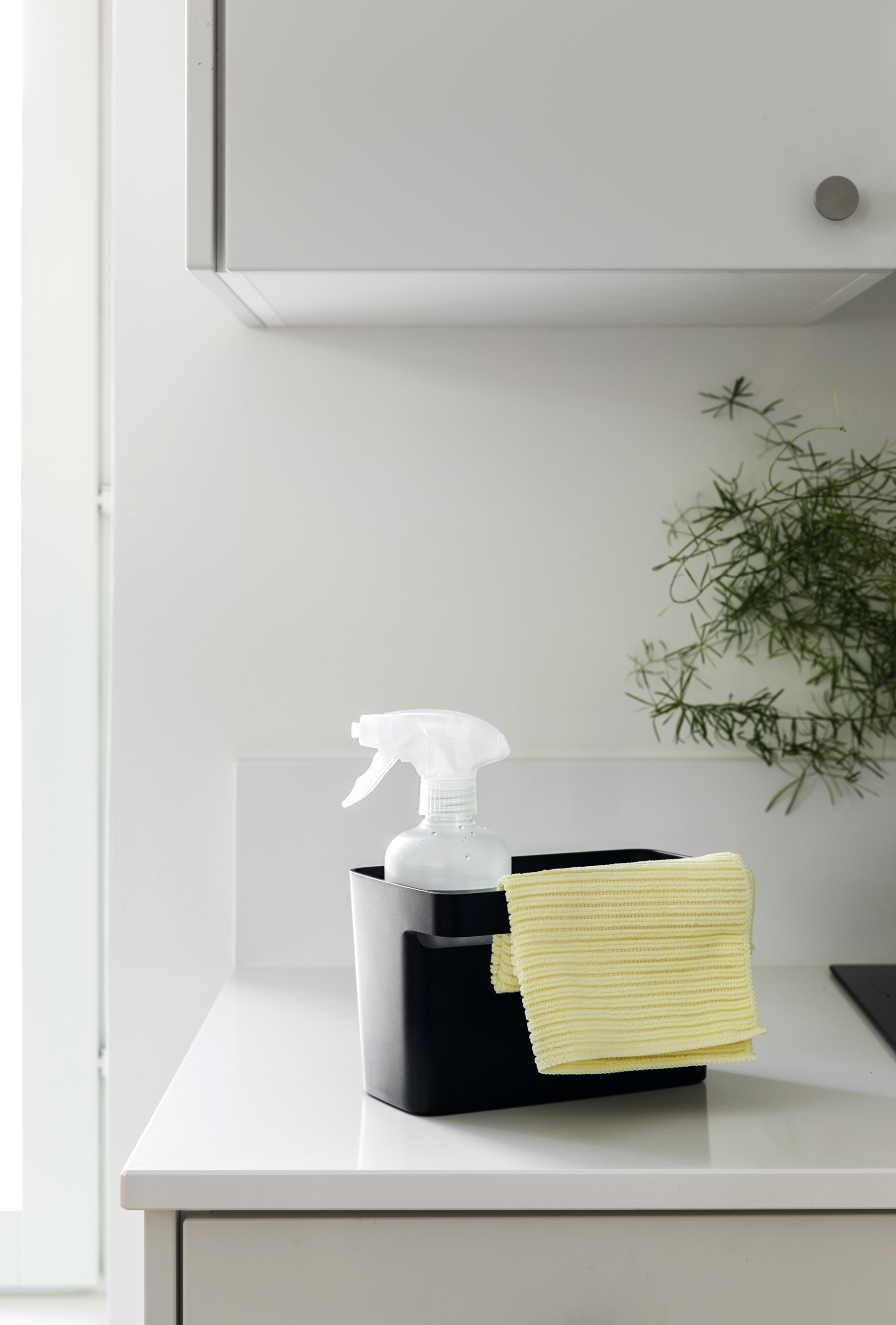 Tilanpuutteessa myös arkisille, päivittäin käytettäville keittiönsiivousvälineille, kuten pesuaineille, tiskiharjalle ja mikrokuituliinalle, voi olla vaikea keksiä paikkaa. Tiskipöydän järjestäjässä on oma paikkansa näistä jokaiselle. Jälleen yksi keittiön tilapulma on ratkottu.