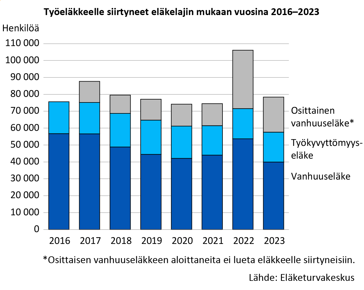 Ensinnäkin vanhuuseläkkeellä aloittaneiden määrä väheni merkittävästi vuonna 2023. Tämä on seurausta erityisesti vanhuuseläkkeen ikärajan nostamisesta, minkä vuoksi kaikki vuonna 1959 syntyneet eivät saavuttaneet vielä vanhuuseläkeikää.