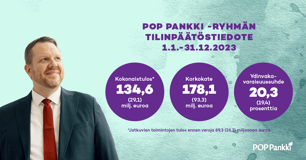 ”Vuosi 2023 oli pankkitoimialalle tuloksellisesti hyvä. POP Pankki -ryhmälle vuosi oli erinomainen. Palkkiotuottojemme kasvu jatkui ja korkokatteemme kasvoi räjähdysmäisesti. Tämän lisäksi luottokantamme jatkoi kasvussa ja onnistuimme säilyttämään talletuskantamme kiristyneestä korkokilpailusta huolimatta. Strateginen linjauksemme keskittyä ydinliiketoimintaamme, eli pankkiliiketoimintaan, osui ajoituksellisesti loistavasti. Meillä on peruspankkijärjestelmäuudistuksemme myötä katse tulevassa sekä oman markkinaosuutemme kasvattamisessa palvelu edellä ja uusia asiakaslähtöisiä tuotteita tarjoten”, toteaa Jaakko Pulli, POP Pankkikeskuksen toimitusjohtaja.
