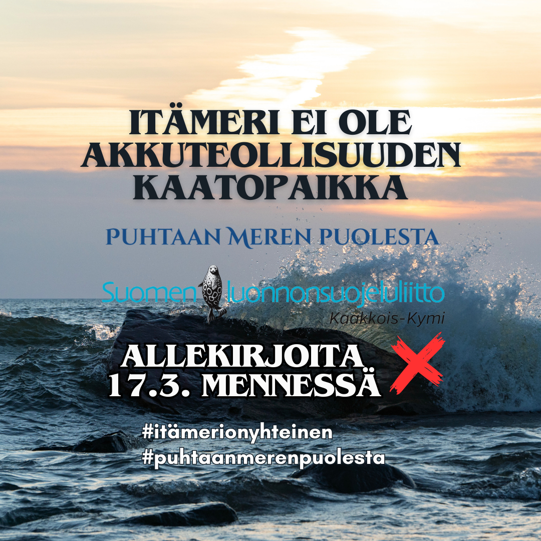 Vaasan hallinto-oikeus antoi tänään 25.4. tärkeän päätöksen Haminan akkumateriaalitehtaan ympäristöluvasta jätetystä 12 valituksesta. Sulfaattia pitää poistaa 90 %:sti. Toiminta saa kuitenkin jatkua kaksi vuotta ennen kuin päästöjä tarvitsee vähentää. Tämä on Itämerelle liian pitkä aika. Lainsäädäntöä on muutettava, jotta raskailta oikeustaisteluilta vältytään. Sulfaatille raja-arvoja ajava kansalaisaloite “Suomen vesistöt EIVÄT ole vihreän siirtymän kaatopaikkoja” jatkuu 27.5. asti.