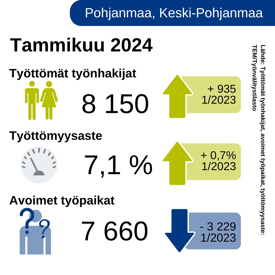 Pohjanmaan ELY-keskusalueella (Pohjanmaa, Keski-Pohjanmaa) oli tammikuun lopussa yhteensä 8 150 työtöntä työnhakijaa. Se on 935 enemmän kuin vuotta aiemmin. Työttömiä oli tammikuussa 471 enemmän kuin joulukuussa 2023. Pohjanmaan ELY-keskusalueen työttömien työnhakijoiden osuus työvoimasta on kuitenkin edelleen Manner-Suomen alhaisin (7,1 %). Koko maassa vastaava osuus on 10,9 %. Joulukuuhun verrattuna työttömyysaste pienentyi 0,5 prosenttiyksikköä Pohjanmaan ELY-keskusalueella ja 0,3 prosenttiyksikköä koko maassa. Tammikuun aikana oli avoinna yhteensä 7 660 työpaikkaa, mikä on 3 229 työpaikkaa (- 29,7 %) vähemmän kuin vuosi sitten. Kokoaikaisesti lomautettuja oli 1 217 eli 366 enemmän kuin vuotta aikaisemmin (+ 43,0 %). Tiedot ilmenevät työ- ja elinkeinoministeriön Työnvälitystilastosta.
