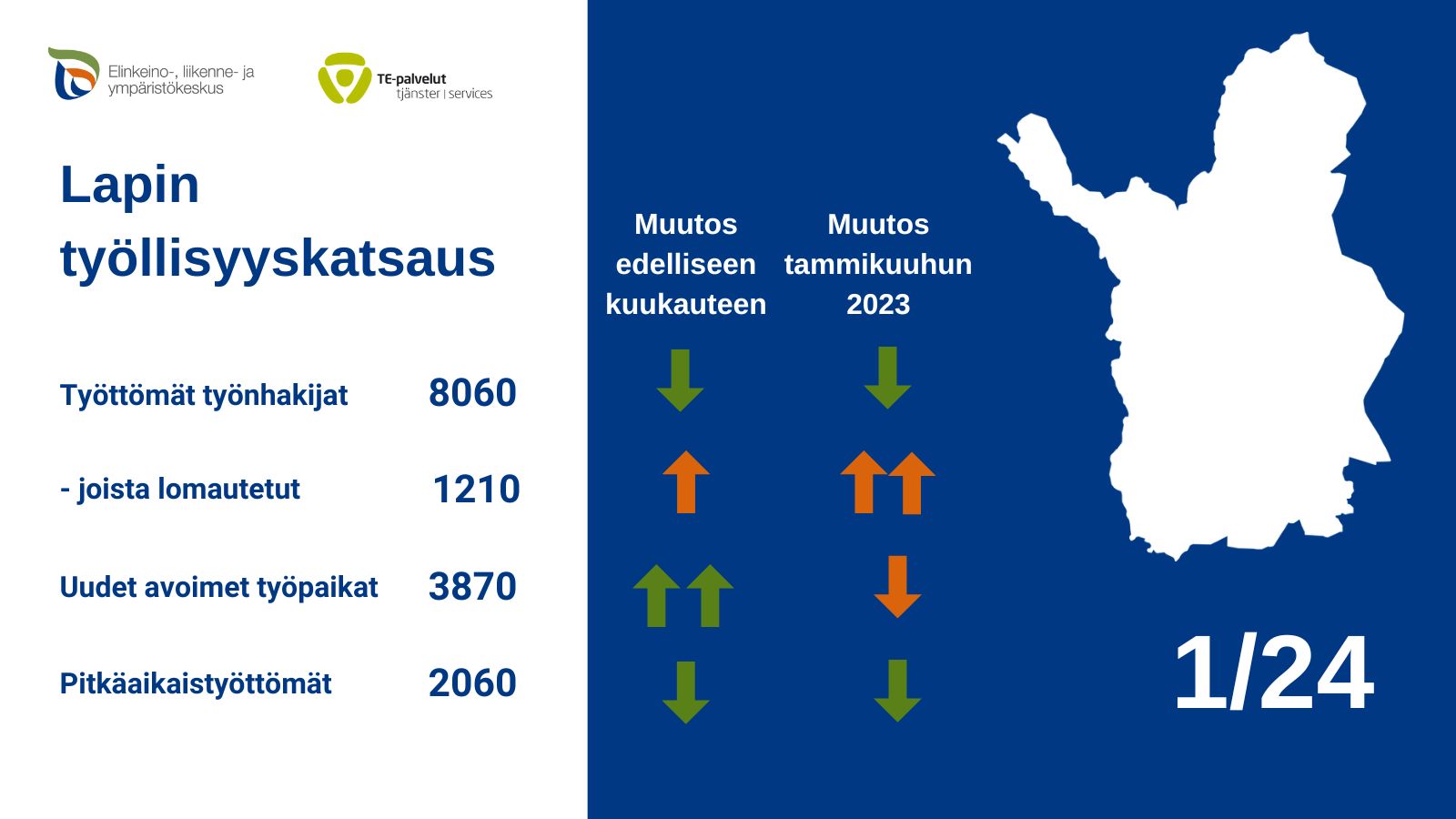 Lapissa oli tammikuun lopussa 8 060 työtöntä työnhakijaa, joista lomautettuja 1 210. Työttömiä oli 110 vähemmän kuin joulukuussa ja 340 vähemmän kuin viime vuonna samaan aikaan. Työttömien osuus työvoimasta oli tammikuun lopussa Lapissa 10,0 % ja koko maassa 10,9 %.