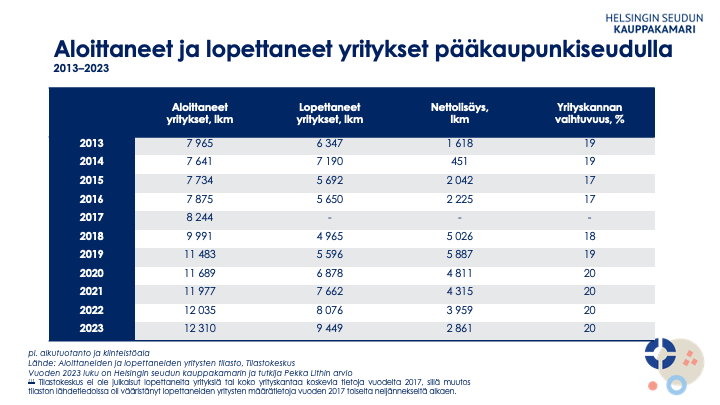 Raportin yrityskannan vaihtuvuudesta ja arvion koko vuonna 2023 lopettaneista yrityksistä Helsingin seudun kauppakamarille on tehnyt tutkija Pekka Lith. Helsingin seudun kauppakamarilla on noin 7 000 jäsentä. Helsingin seudun kauppakamarin toiminta-alue kattaa 21 kuntaa Uudenmaan alueella. Helsingin seudun kauppakamarin neuvontapalvelu tarjoaa maksutonta neuvontaa jäsenilleen erilaisissa oikeudellisissa asioissa.