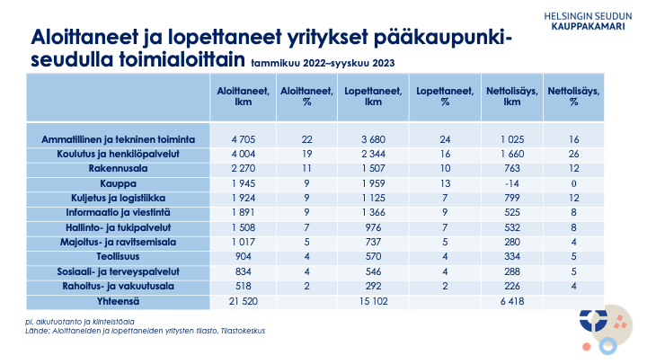 Pääkaupunkiseudulla lopetti toimintansa 9 450 yritystä vuonna 2023, arvioi Helsingin seudun kauppakamari Tilastokeskuksen alkuvuoden lukuihin perustuen. Lopettaneita yrityksiä olisi arvion mukaan 17 prosenttia enemmän kuin edellisvuonna. Luvuissa ei ole huomioitu alkutuotantoa ja kiinteistöalan yrityksiä.