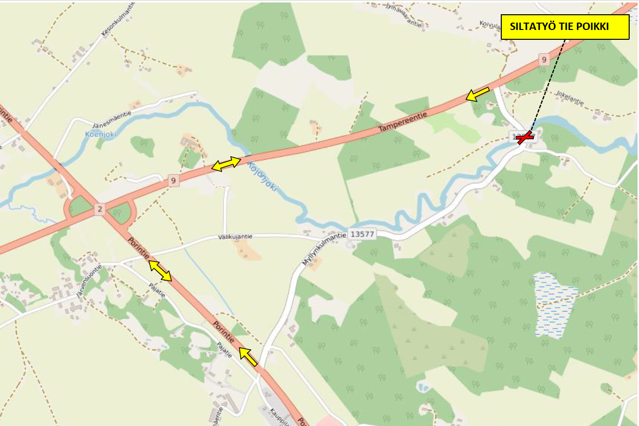 Myllynkulmantie (tie 13577) katkaistaan liikenteeltä Jokiniementien ja Jokelantien välillä sijaitsevan Myllynkulman sillan kohdalta maanantaina 4.3.2024 klo 9.00 ja avataan liikenteelle viimeistään perjantaina 12.4.2024 kello 15.00. Työn valmistuessa tie voidaan avata aikaisemminkin.