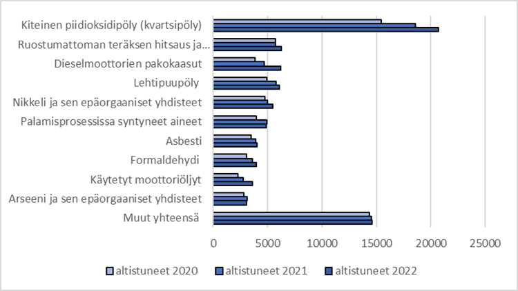Ruostumattoman teräksen hitsaushuuruille altistuneita ilmoitettiin noin 6 300, dieselmoottoreiden pakokaasulle lähes 6 200 ja lehtipuupölylle altistuneiksi ilmoitettuja oli lähes 6 100. Nikkelille altistuneita ilmoitettiin noin 5 500 ja palamisprosesseissa syntyneille aineille altistuneita noin 4 900. Asbestille ja formaldehydille altistuneita oli molempia noin 4 000. Käytetyille moottoriöljyille altistuneita ilmoitettiin noin 3 600 henkilöä. (Kuva liitteenä.)