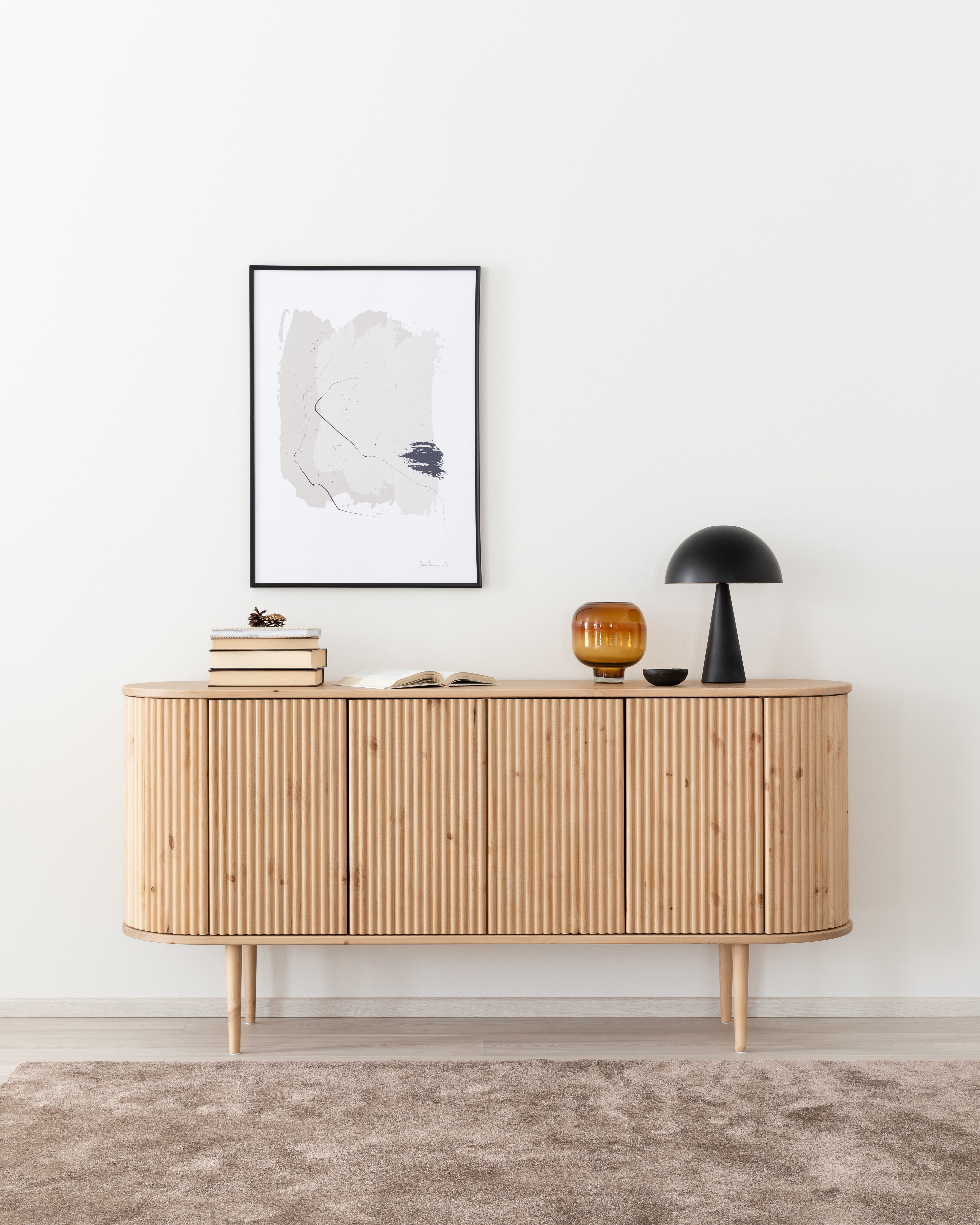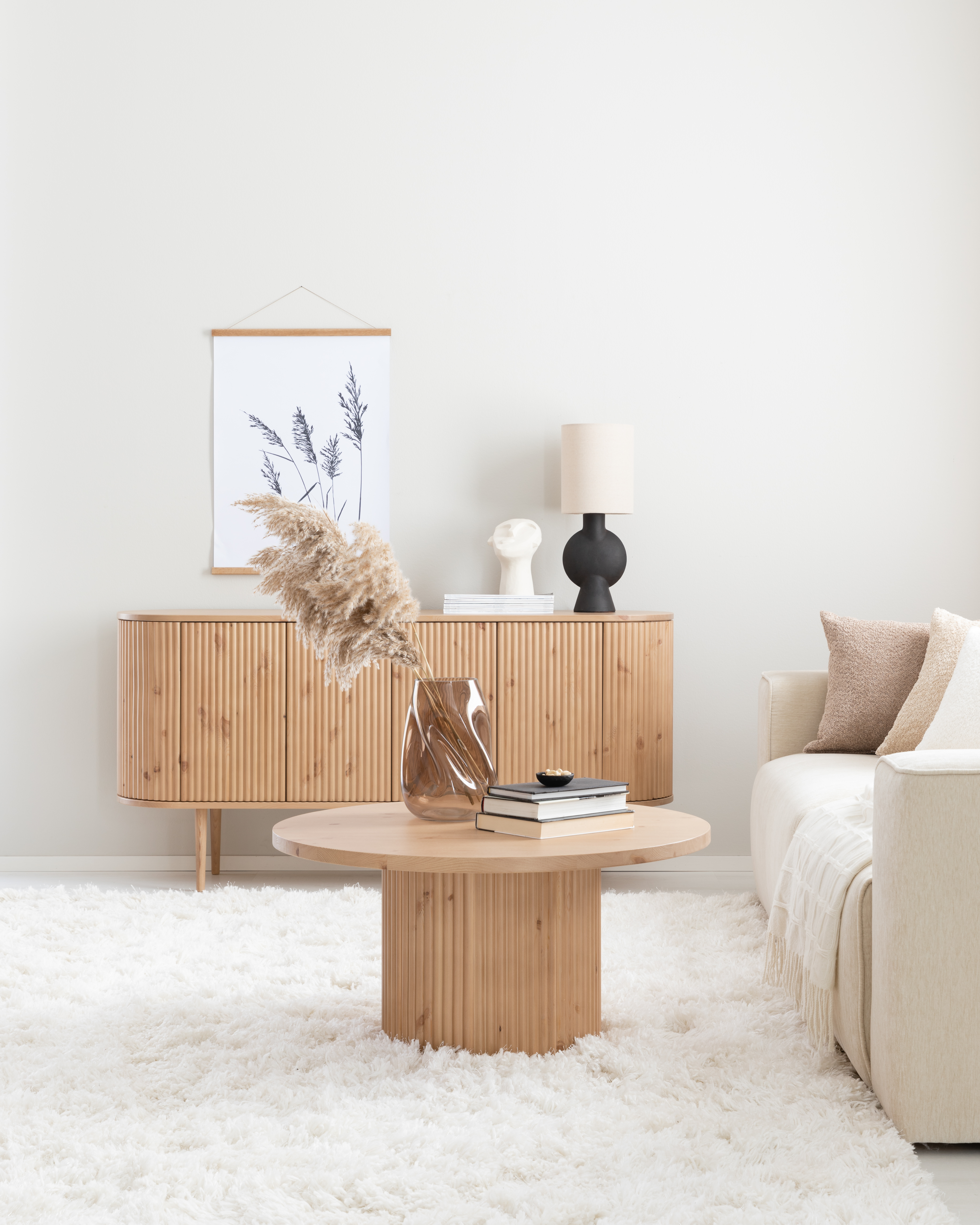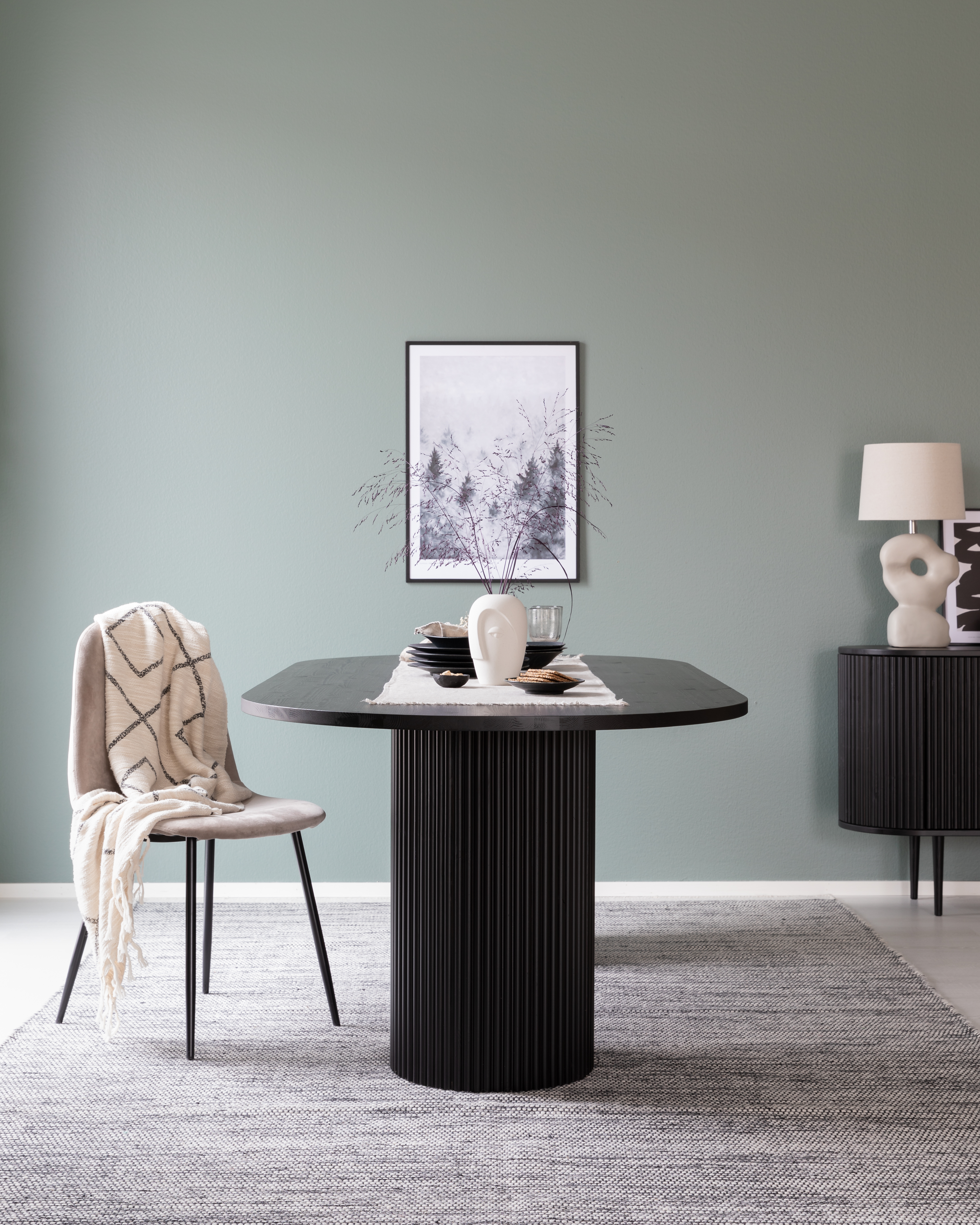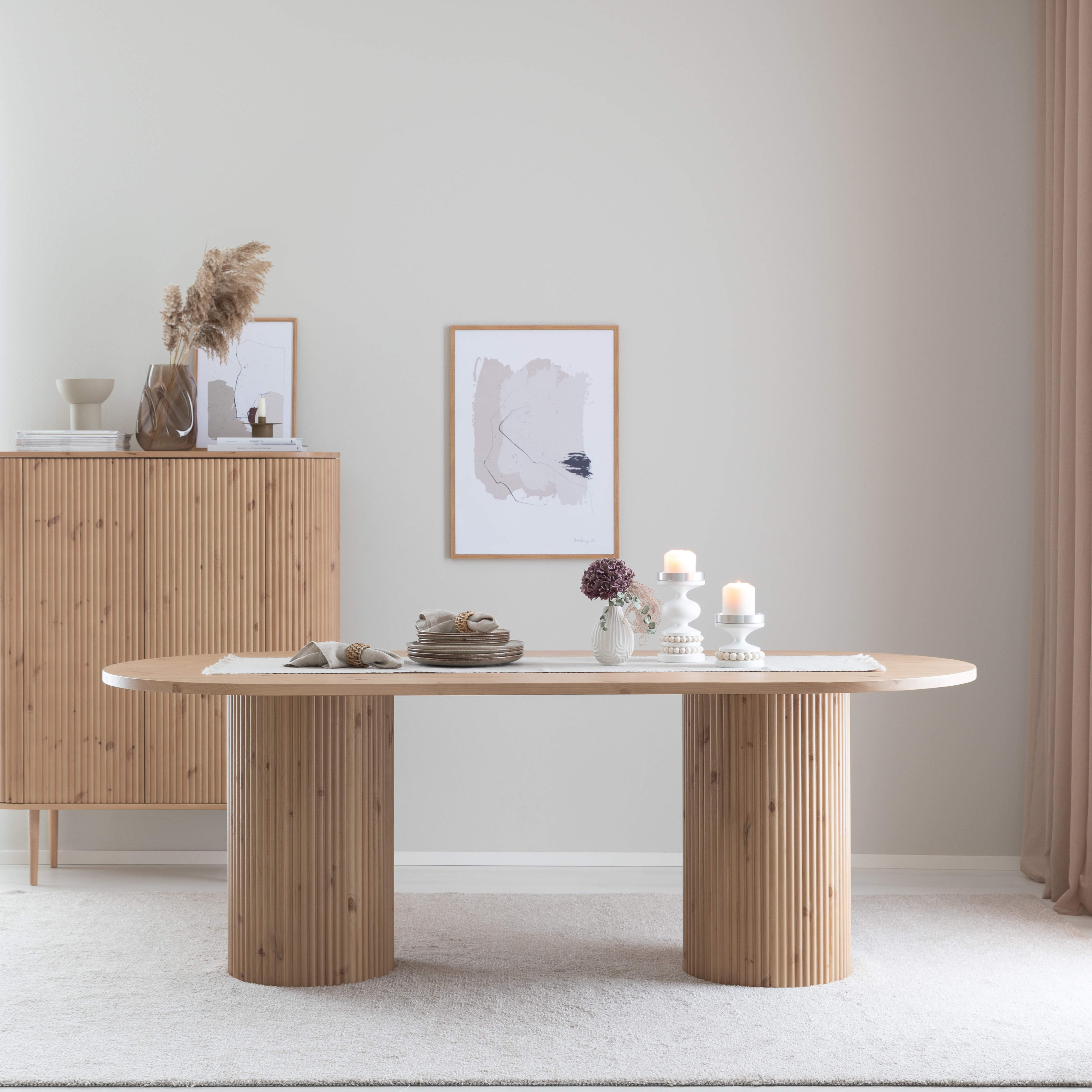 Taimi-sarjan ovaali ruokapöytä ja kaappi sävyssä Hiekka Susanna Ranua Veke