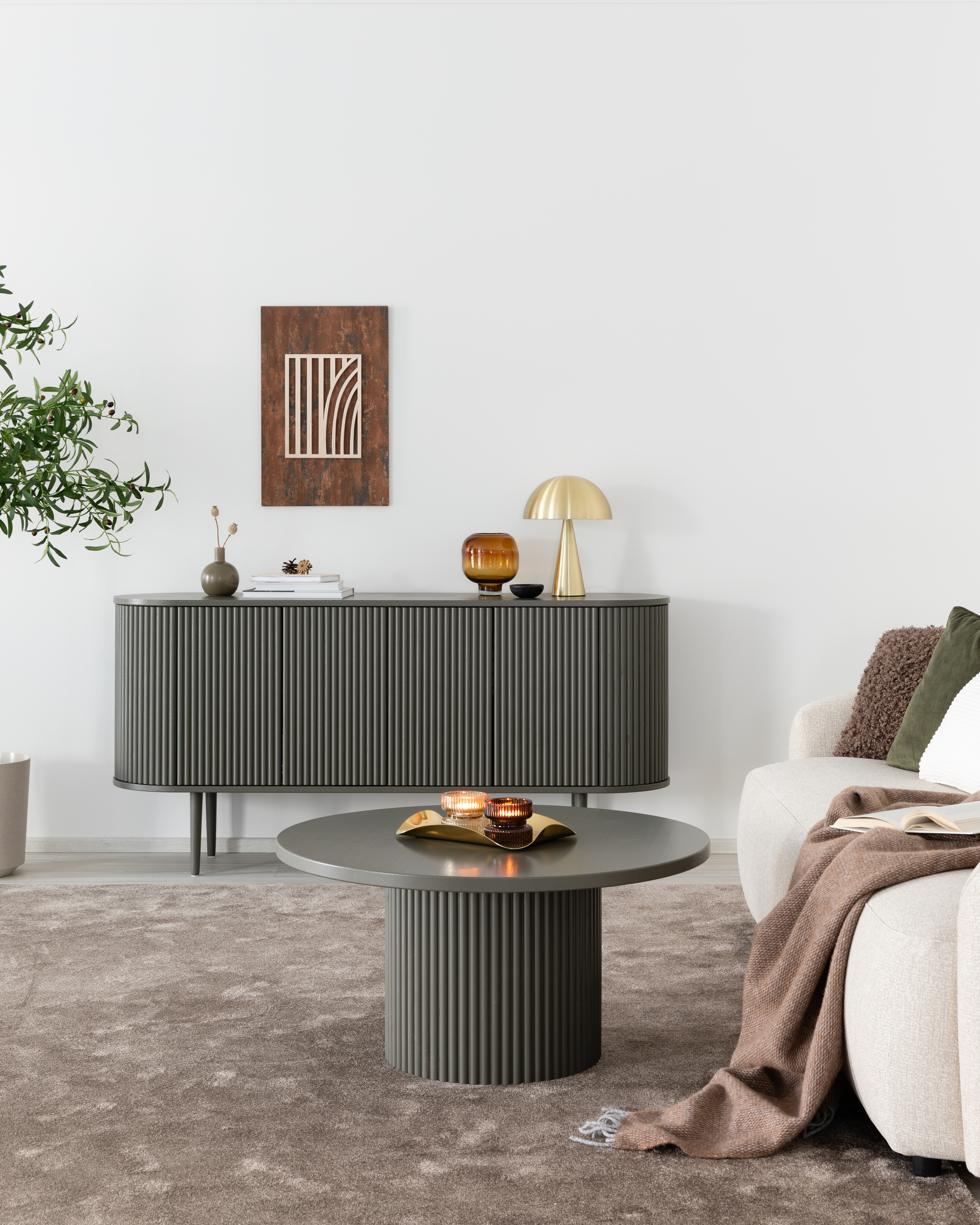 Taimi-senkki 153x41x75 cm ja Taimi-sohvapöytä uutuussävyssä Sammal