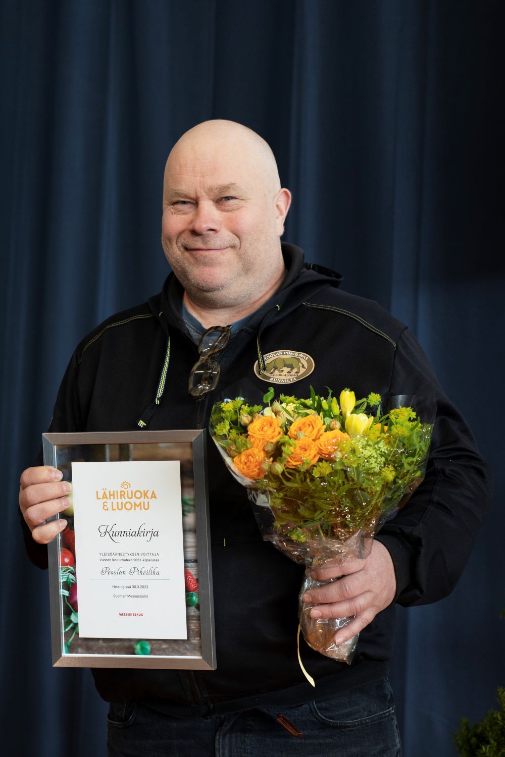 Vuoden lähiruokateko 2023 yleisöäänestyksen voittaja Pesolan pihvilihan Antti Niskanen.