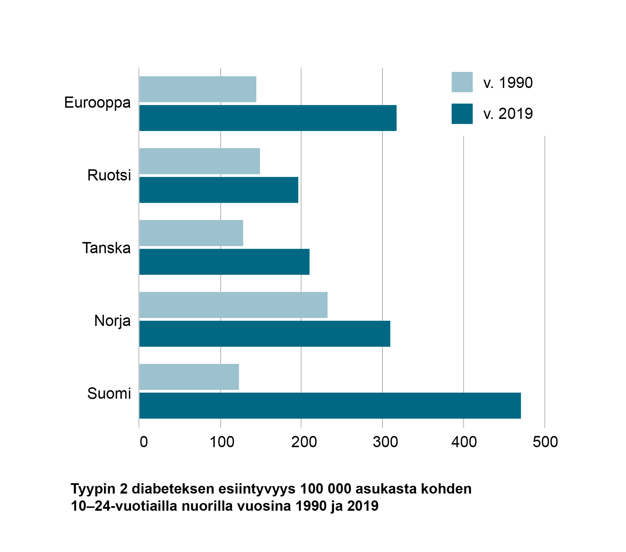 Vuonna 1990 suomalaisilla nuorilla ja nuorilla aikuisilla oli tyypin 2 diabetesta hieman vähemmän kuin muissa Pohjoismaissa, mutta tyypin 2 diabeteksen esiintyvyys kasvoi Suomessa 285 % vuodesta 1990 vuoteen 2019 (kuva 1). Suomessa kasvuprosentti oli suurempi kuin missään muussa tässä tutkimuksessa vertaillussa maassa. Suomessa 10–24-vuotiailla esiintyi tyypin 2 diabetesta 471:llä jokaista 100.000 kohti.