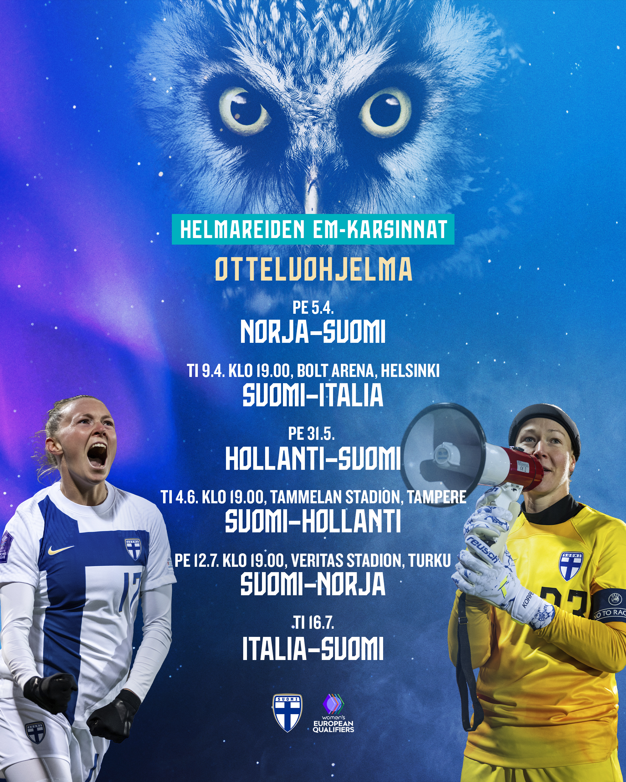 Perjantaina 12. heinäkuuta Helmarit emännöi Norjaa Turussa Veritas Stadionilla. Karsintojen lohkovaihe päättyy vierasotteluun Italiaa vastaan tiistaina 16. heinäkuuta. Kaikki Suomen kotiottelut käynnistyvät kello 19.00.