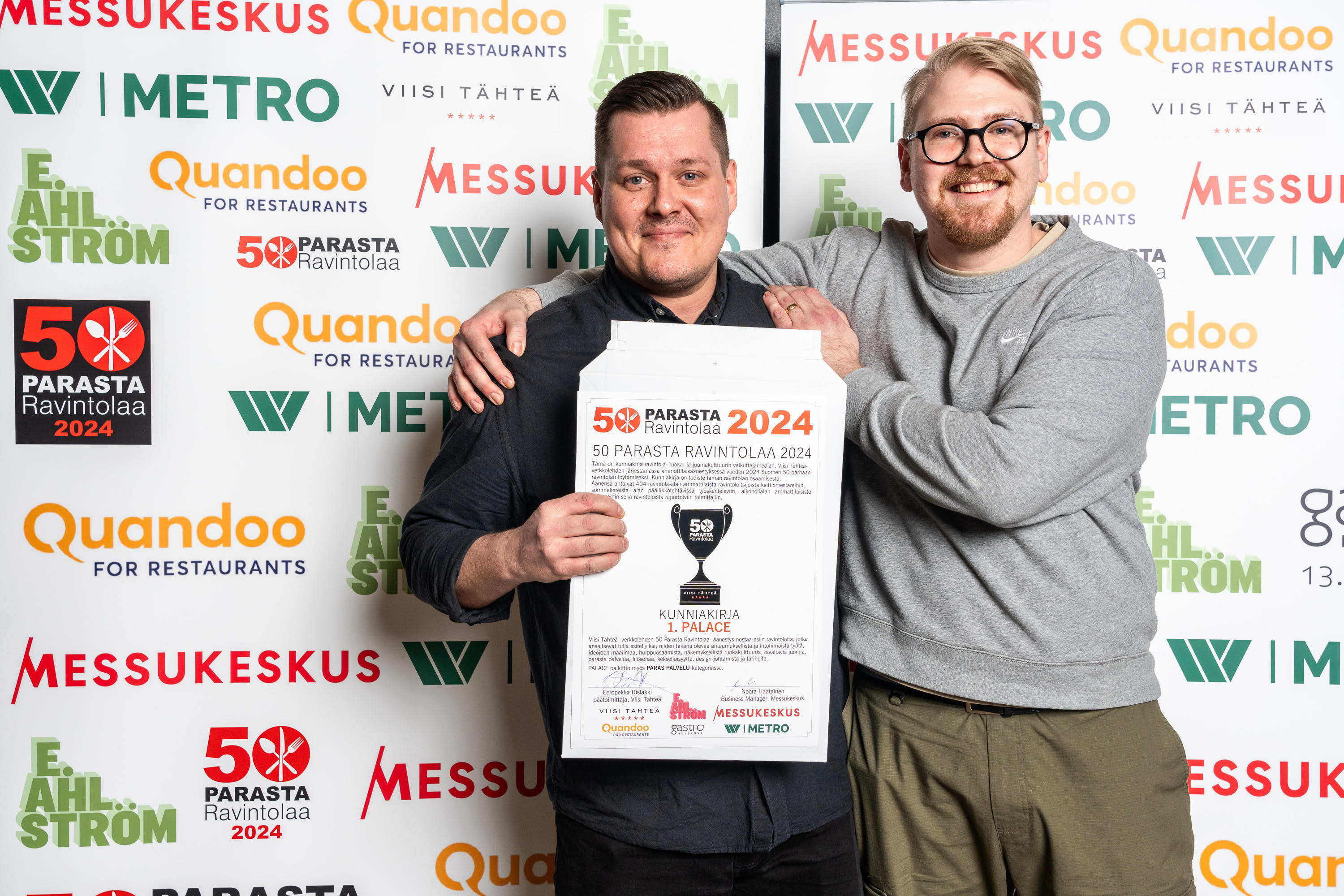 Helsinkiläinen Ravintola Palace vei nimiinsä Suomen 50 Parasta Ravintolaa 2024 -äänestyksen ykkössijan. Ravintola-alan ammattilaiset äänestivät Palacen listan voittajaksi jo viidennen kerran peräkkäin. Ammattilaisten ammattilainen on BasBasin ravintoloitsija Nicolas Thieulon. Paras muutoksentekijä on Grönin keittiömestari Toni Kostian. Äänestys täyttää tänä vuonna 20 vuotta.