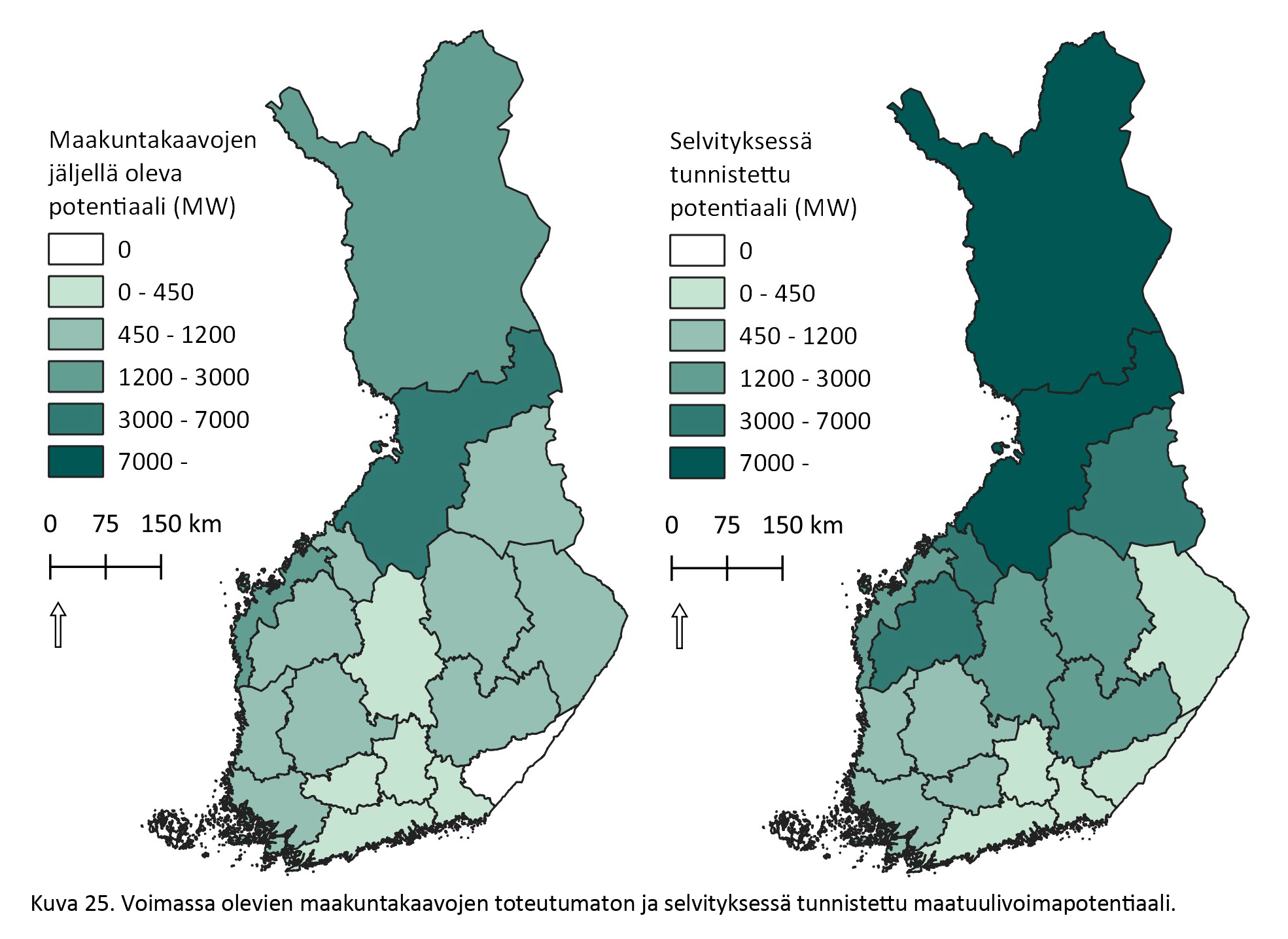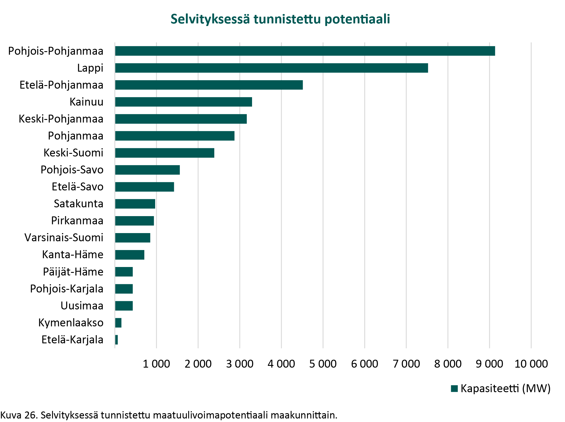 Selvityksessä tuotetut maakuntakohtaiset tuulivoimapotentiaaliarviot osoittavat, että erot alueiden välillä ovat suuria ja ne kasvavat entisestään. Valtaosa tuulivoimapotentiaalista sijoittuu länteen ja pohjoiseen, jossa on myös suurin osa toteutuneista ja vireillä olevista tuulivoimahankkeista. Tuulivoimapotentiaalin epätasaista maantieteellistä jakautumista korostaa vielä merituulivoiman kehittyminen ja sen mahdollinen nouseminen varteenotettavaksi energiantuotantomuodoksi.
