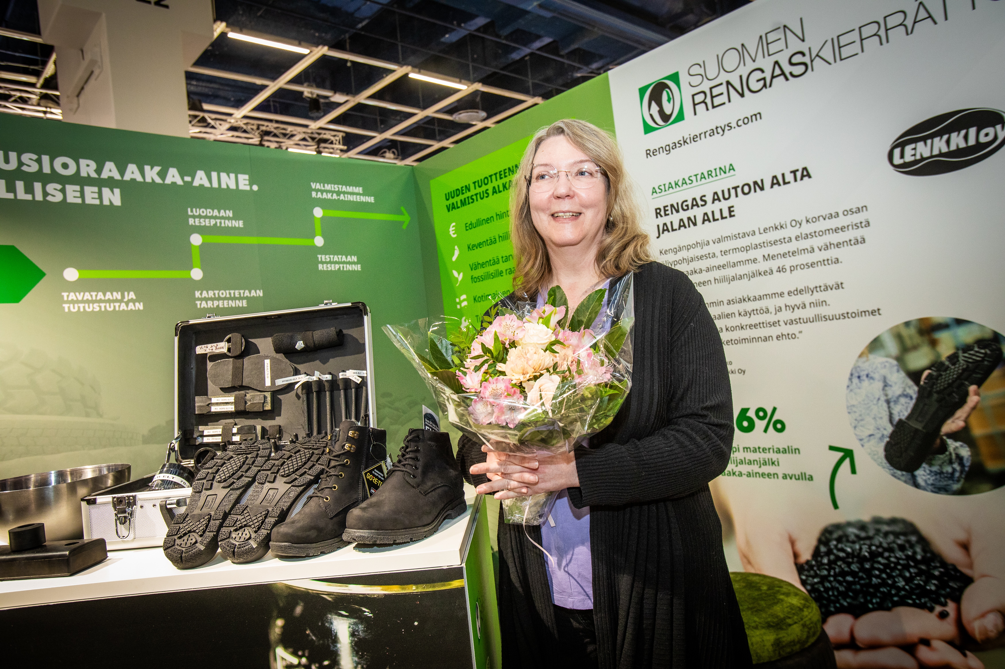 Renkaista valmistettua uusioraaka-ainetta hyödyntävän Lenkki Oy:n uuden sukupolven kengänpohjat valittiin kestävimmäksi innovaatioksi PacTec, FoodTec ja Plast Expo Nordic -messuilla. Kankaanpäässä toimiva Lenkki tähtää viennin vahvistamiseen suomalaisen kiertotalouden avulla.