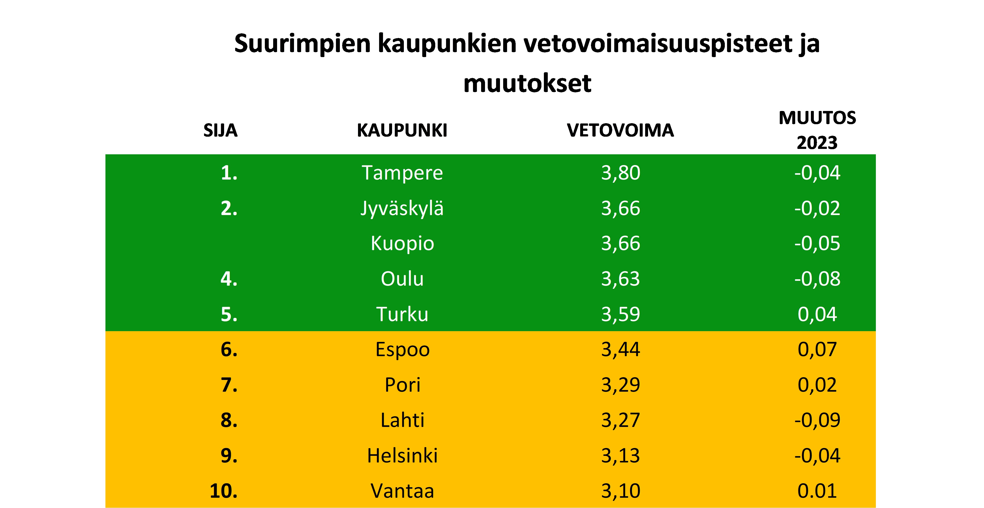 Espoo on kasvattanut eniten vetovoimaansa Suomen kymmenen suurimman kaupungin joukossa. Tampere on edelleen Suomen vetovoimaisin kaupunki, Jyväskylä ja Kuopio ovat jaetulla toisella sijalla.