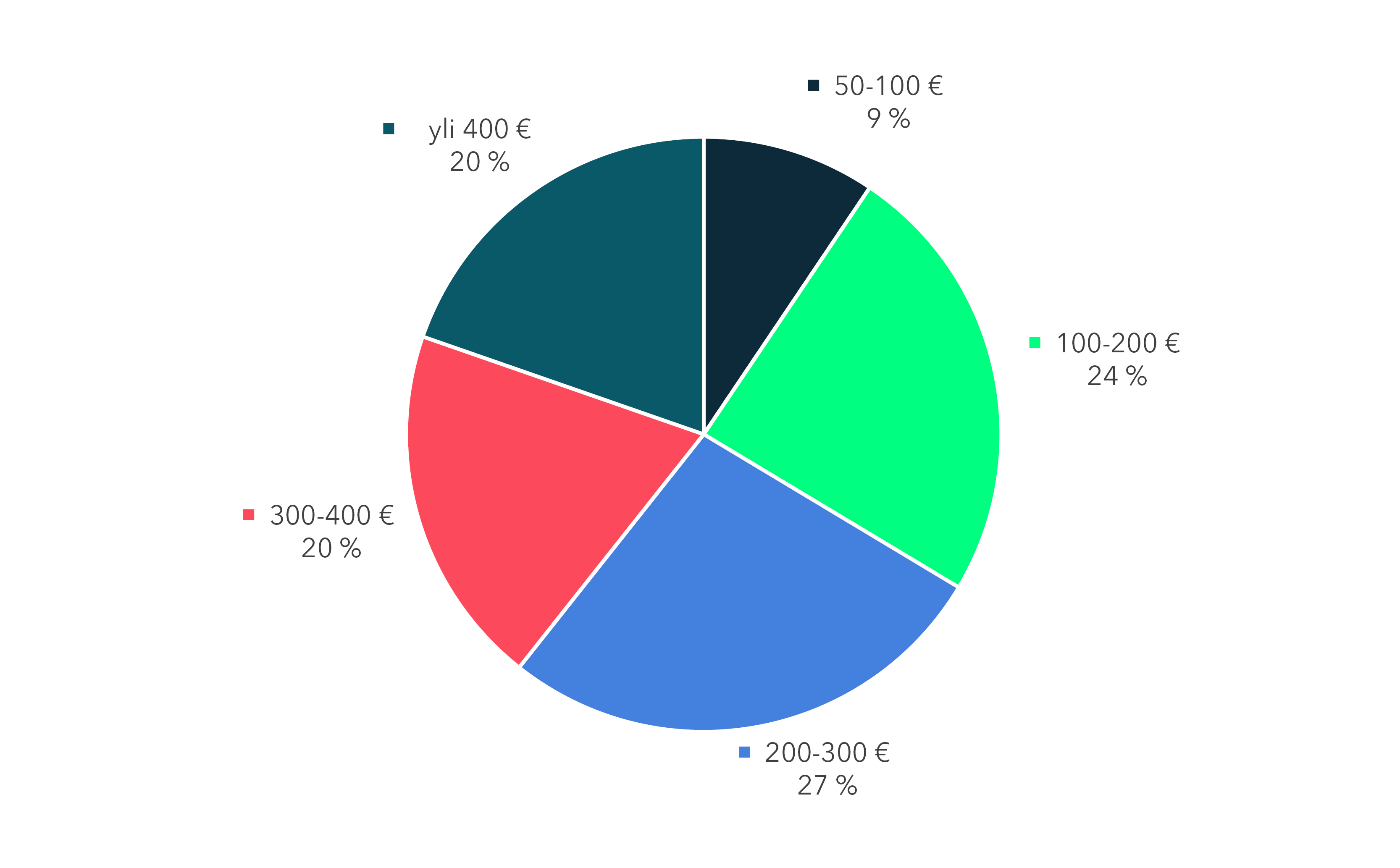 Pyysimme jäseniä arvioimaan, kuinka suuri taloudellinen vaikutus työttömyysturvan leikkauksilla on ollut tai tulee olemaan heidän kuukausituloihinsa. Suurin osa vastanneista, eli 27 prosenttia, vastasi vaikutuksen olevan 200–300 euroa kuukaudessa. Valtaosalla arvioi vaikutusta olevan 200– yli 400 euroa kuukaudessa.