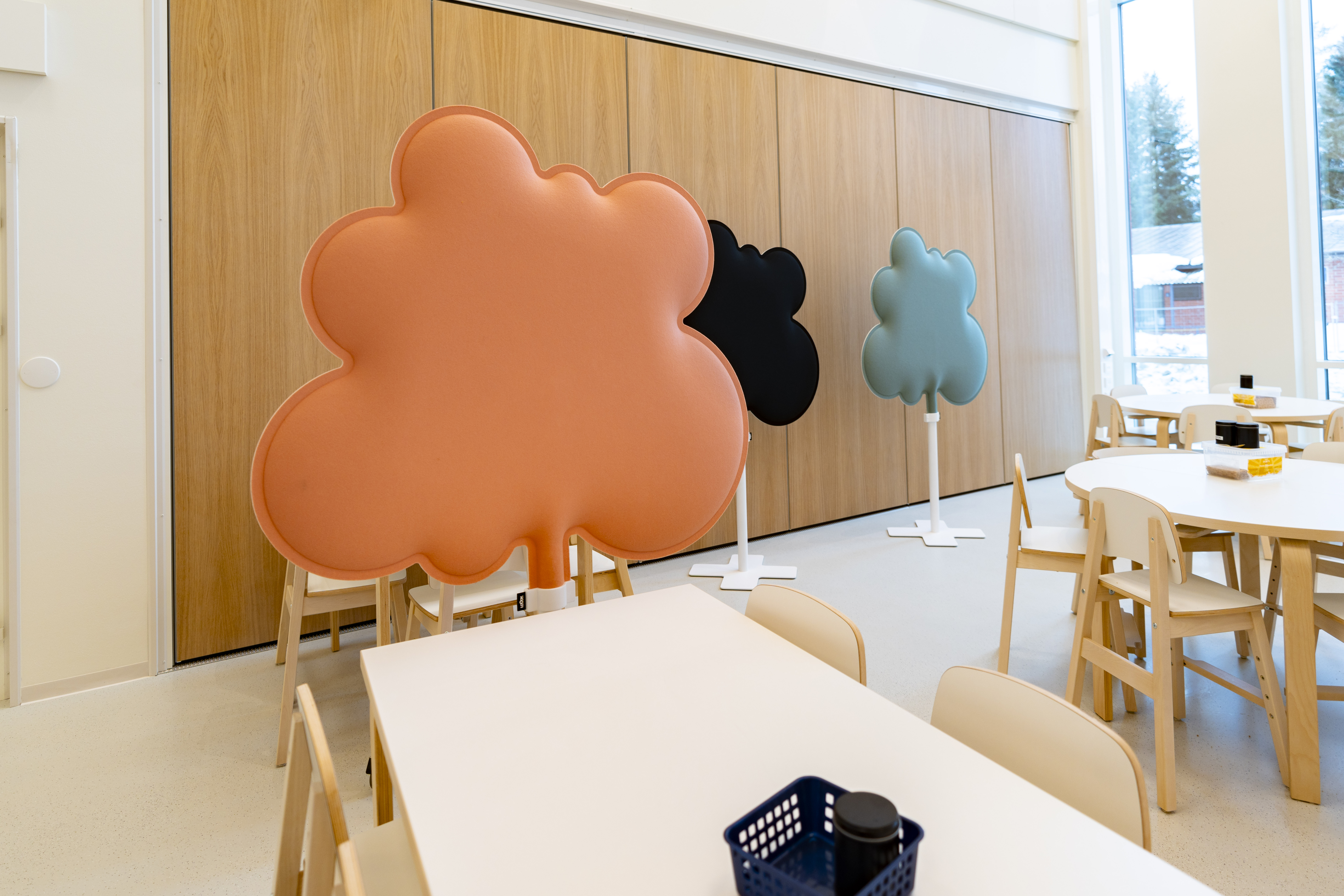 - Se on huomioitu niin kattojen kuin seinien akustiikkalevyissä kuin kalusteissakin. Kun ryhmätilan ovi on kiinni, ei käytävälle kuulu juuri mitään.