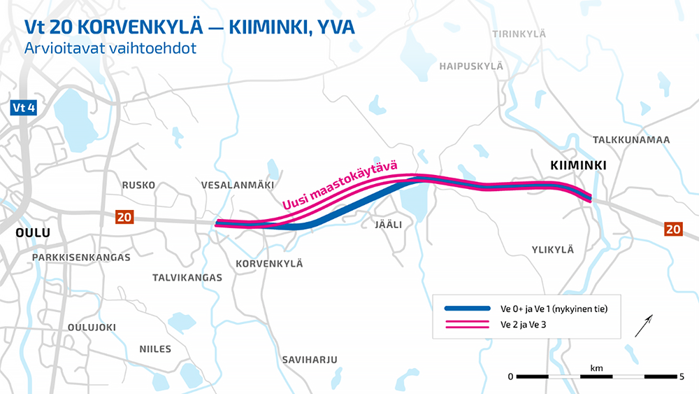 Käynnissä olevassa YVA-menettelyssä tarkastellaan neljää vaihtoehtoa valtatien 20 parantamiseksi Kiimingin ja Korvenkylän välillä: