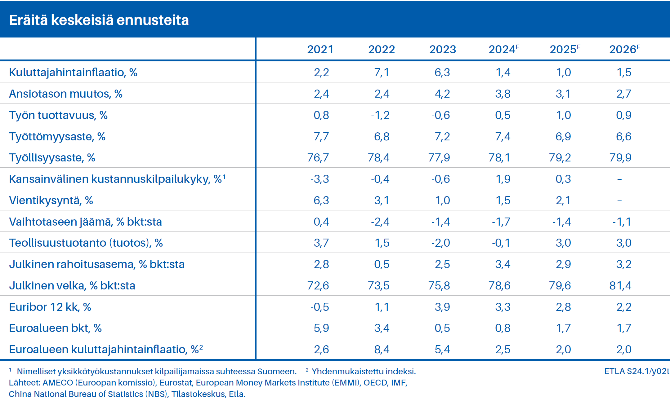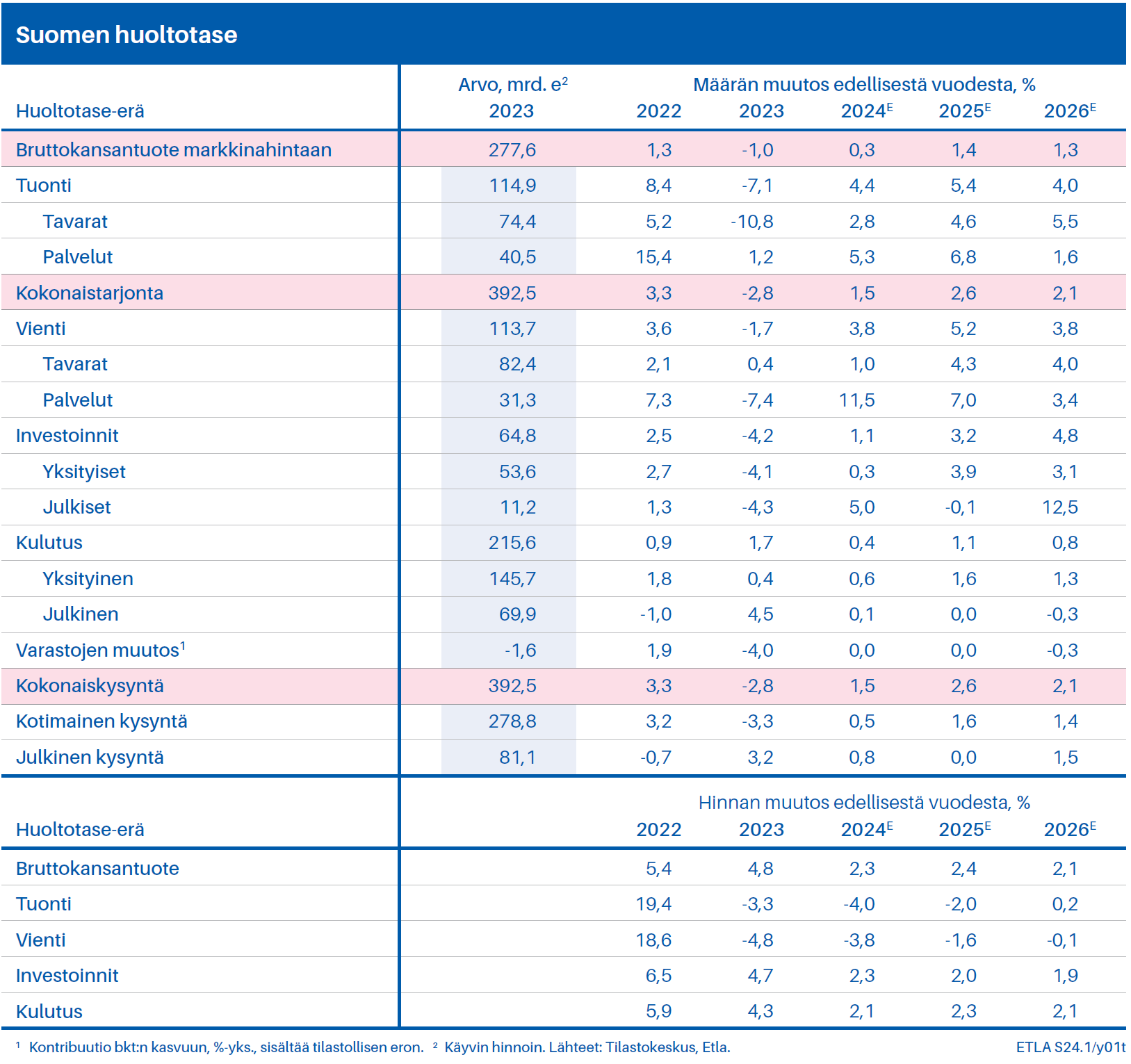 - Suomen talous kasvaa tänä vuonna 0,3 prosenttia eli jää lähes viime vuoden tasolle. Alkuvuonna bkt vielä supistuu, mutta loppuvuodesta suhdanne jo kääntyy. Ensi vuonna bkt:n kasvu yltää 1,4 prosenttiin ja vuonna 2026 lähes samaan eli 1,3 prosenttiin.