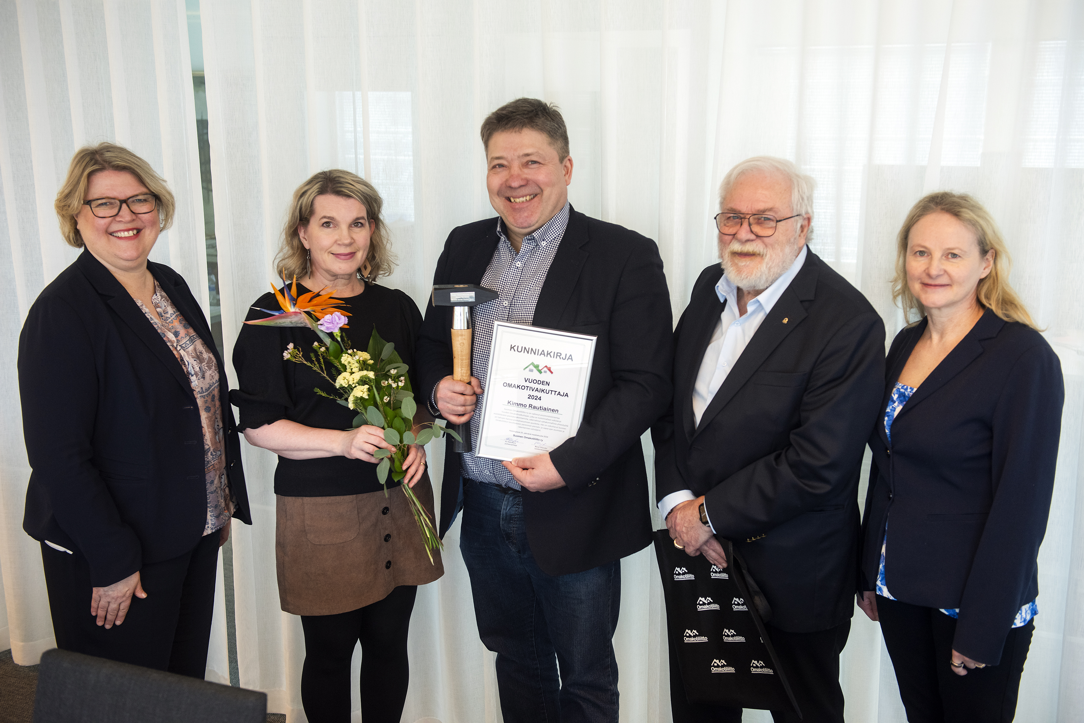 Tunnustus jaettiin tänä vuonna ensimmäistä kertaa. Sen luovuttivat Kimmo Rautiaiselle Omakotiliiton toiminnanjohtaja Marju Silander, puheenjohtaja Ari Rehnfors ja talous- ja kehityspäällikkö Katja Keränen 25.3.2024.