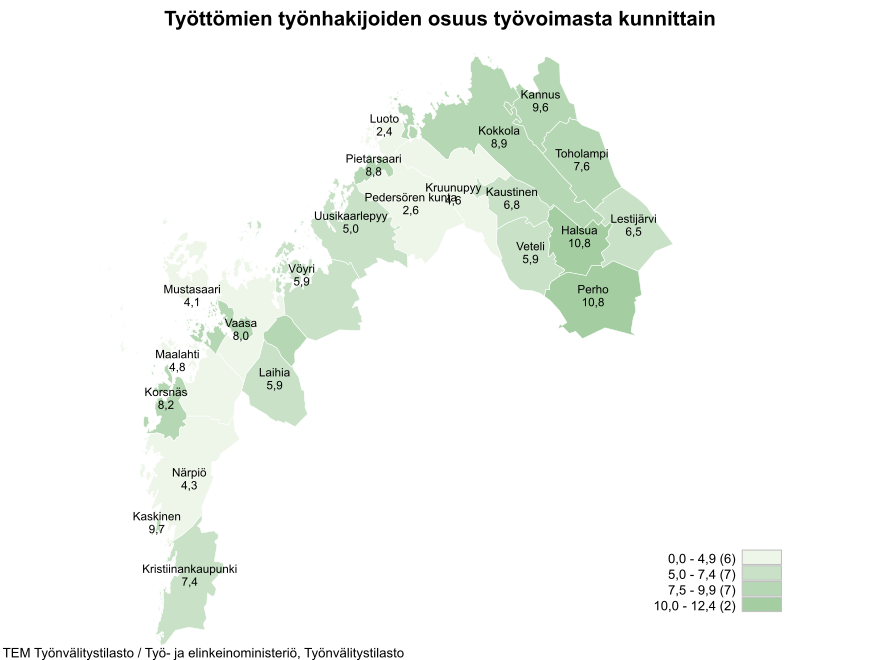 Työttömien työnhakijoiden määrä kasvoi lähes kaikissa Pohjanmaan ELY-keskusalueen seutukunnissa vuoden takaiseen verrattuna. Työttömien määrä kasvoi eniten Vaasan seudulla (+ 475) ja pienentyi eniten Suupohjan rannikkoseudulla (- 58). Pohjanmaan ELY-keskusalueen kunnista alhaisin työttömyysaste oli Luodossa, joissa työttömien työnhakijoiden osuus työvoimasta oli 2,4 %. Työttömien työnhakijoiden osuus työvoimasta oli suurinta Perhossa (10,8 %). Vaasan työttömyysaste oli 8,0 %, Kokkolan 8,9 % ja Pietarsaaren 8,8 %.