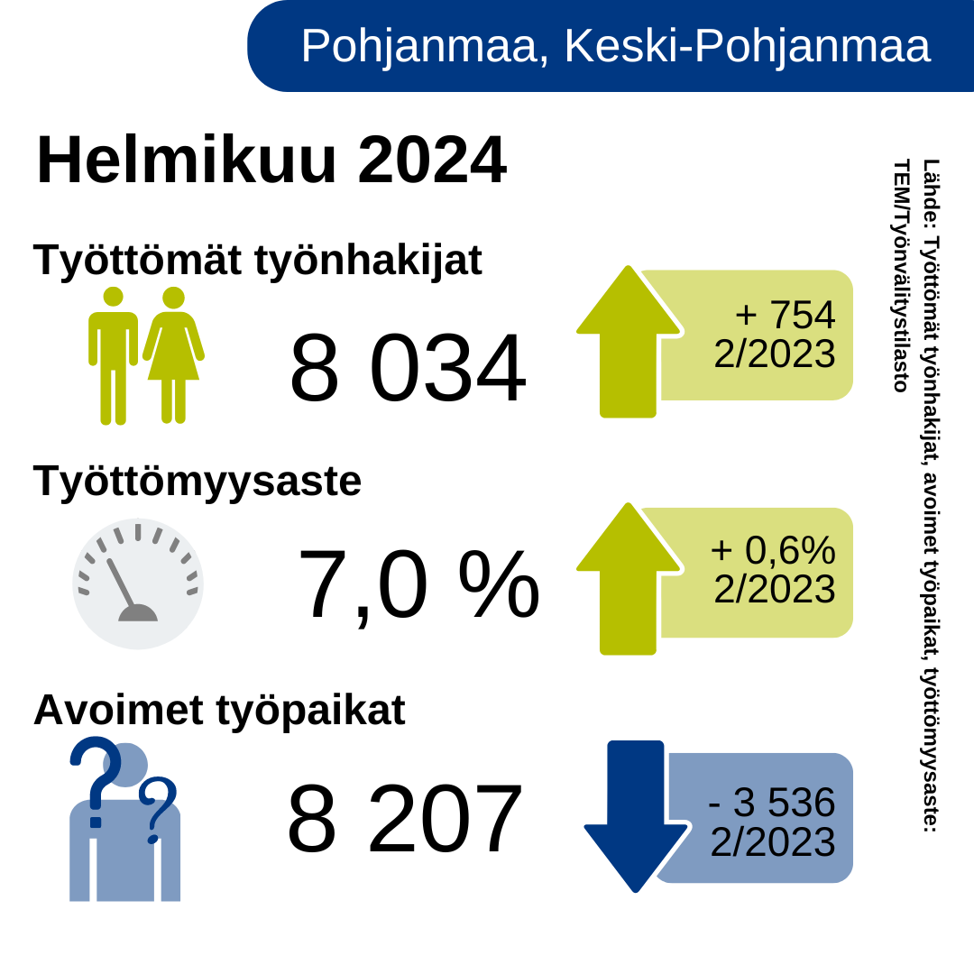 Helmikuun työllisyyskatsaus: Työttömyys kasvaa ja avointen työpaikkojen määrä laskee edelleen (Pohjanmaa, Keski-Pohjanmaa)