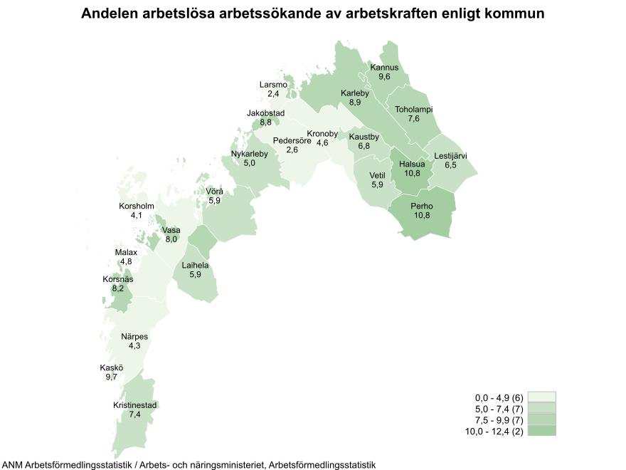 Antalet arbetslösa arbetssökande ökade i nästan alla ekonomiska regioner inom området för NTM-centralen i Österbotten jämfört med året innan. Antalet arbetslösa ökade mest i Vasa ekonomiska region (+ 475) och minskade mest i Sydösterbotten (- 58). Av kommunerna inom området för NTM-centralen i Österbotten var arbetslöshetsgraden lägst i Larsmo där andelen arbetslösa arbetssökande av arbetskraften var 2,4 %. Andelen arbetslösa arbetssökande av arbetskraften var högst i Perho (10,8 %). Arbetslöshetsgraden i Vasa var 8,0 %, i Karleby 8,9 % och i Jakobstad 8,8 %.