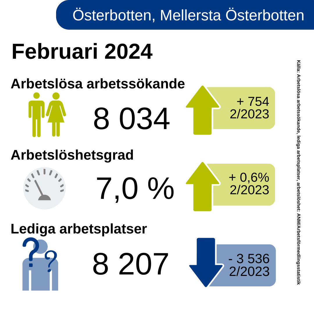Inom området för NTM-centralen i Österbotten (Österbotten, Mellersta Österbotten) fanns det i slutet av februari sammanlagt 8 034 arbetslösa arbetssökande. Det är 754 fler än för ett år sedan. Antalet arbetslösa var i februari 116 färre än i januari. Andelen arbetslösa arbetssökande av arbetskraften inom området för NTM-centralen i Österbotten är dock fortsättningsvis den lägsta i Fastlandsfinland (7,0 %). Motsvarande andel i hela landet är 10,8 %. Jämfört med januari månad minskade arbetslöshetsgraden med 0,1 procentenheter inom Österbottens NTM-centrals område och i hela landet. Under februari fanns det totalt 8 207 lediga arbetsplatser, vilket är 3 536 arbetsplatser (- 30,1 %) färre än för ett år sedan. Antalet heltidspermitterade var 1 182 dvs. 218 fler (+ 22,6 %) än för ett år sedan. Uppgifterna framgår av arbets- och näringsministeriets Arbetsförmedlingsstatistik.
