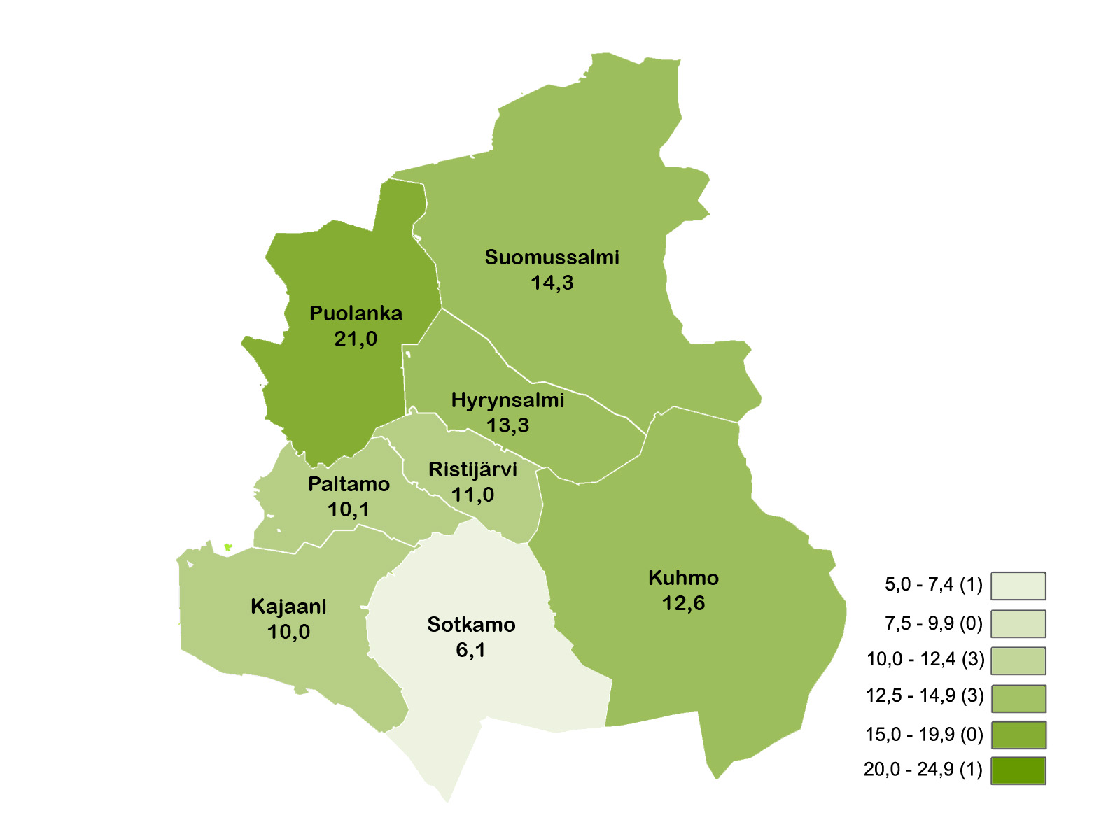 Työttömyysaste oli Kainuussa kuun lopussa 10,4 %, mikä on alueista kuudenneksi vähiten ja 0,6 prosenttiyksikköä enemmän kuin vuotta aiemmin. Koko maassa työttömyysaste oli 10,8 %, mikä on 1,1 prosenttiyksikköä vuoden takaista enemmän.
