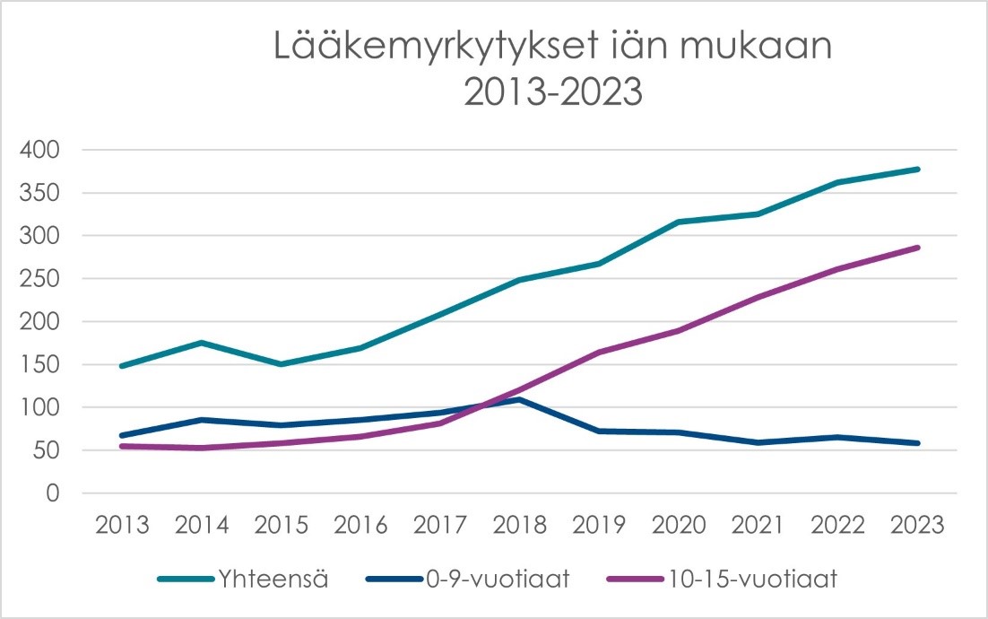 Lasten ja nuorten käynnit lääkemyrkytysten vuoksi yliopistosairaaloiden lasten päivystyksissä ovat lisääntyneet merkittävästi kymmenessä vuodessa. Vuonna 2013 lääkemyrkytyksiä oli vuoden aikana 148 ja vuonna 2023 määrä oli 377. Lääkemyrkytysten kasvu kertoo nuorten tyttöjen lisääntyneestä pahoinvoinnista.
