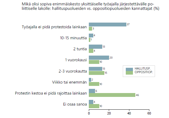 62 prosenttia suomalaisista on sitä mieltä, että poliittisille lakoille pitäisi asettaa lakon keston suhteen ainakin jonkinlaiset rajat. Enemmistö (56 %) on myös sitä mieltä, että tuon rajan pitäisi olla melko lyhyt, korkeintaan kahdesta kolmeen vuorokautta. Orpon hallituksen esittämälle korkeintaan 24 tunnin kestolle löytyy Arvo- ja asennetutkimuksen tulosten valossa 42 prosentin kannatus.