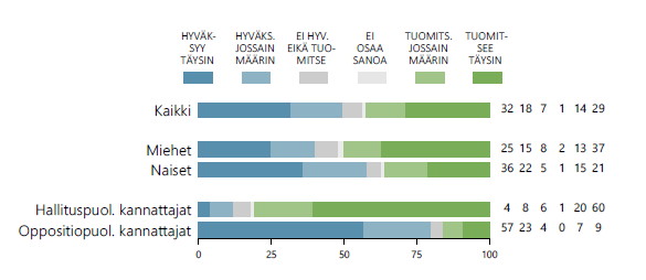 Päähallituspuolueiden ja vasemmistopuolueiden kannattajien näkemykset asiaan eroavat toisistaan kuin yö ja päivä. Kokoomuksen kannattajista 92 prosenttia ja perussuomalaisten kannattajista 82 prosenttia tukee hallituksen uudistuksia. Enemmistöt vasemmistoliiton (94 %), SDP:n (84 %) ja vihreiden (79 %) kannattajista eivät pidä hallituksen työmarkkinauudistuksia Suomen talouden kannalta välttämättöminä.