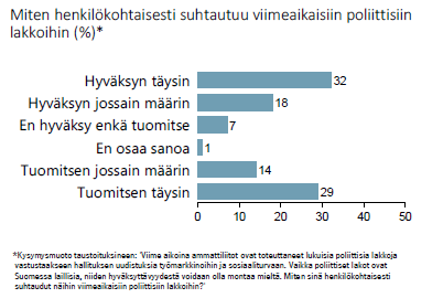 Kevään 2024 Arvo- ja asennetutkimuksessa selvitettiin nyt ensi kertaa, mihin suomalaiset laittaisivat poliittisen lakkoilun rajat. Suomalaisista 17 prosenttia on sitä mieltä, että työajalla ei pidä protestoida lainkaan. 27 prosentin mielestä lakkojen kestoa ei pidä rajoittaa lainkaan.