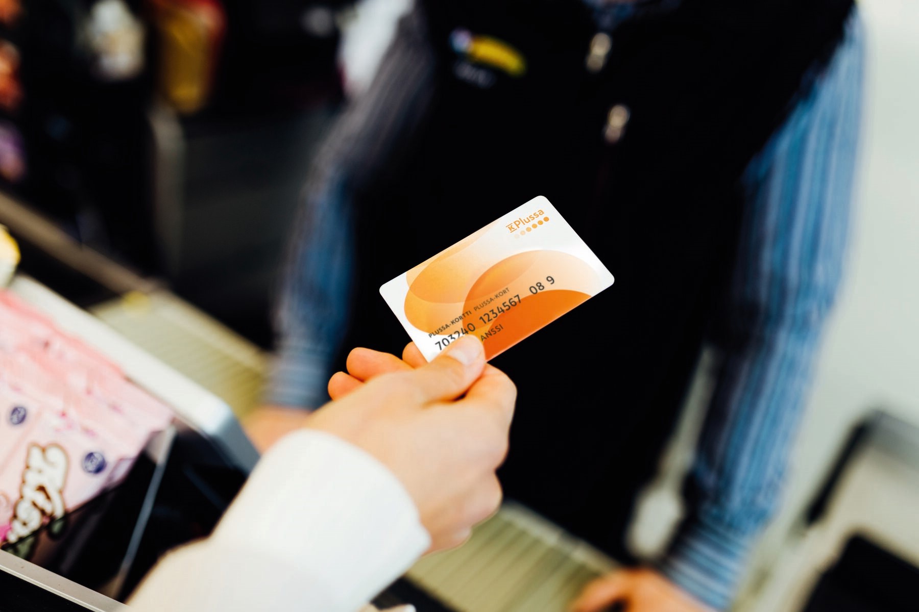 Kuvassa käsi ojentaa K-Plussa korttia.