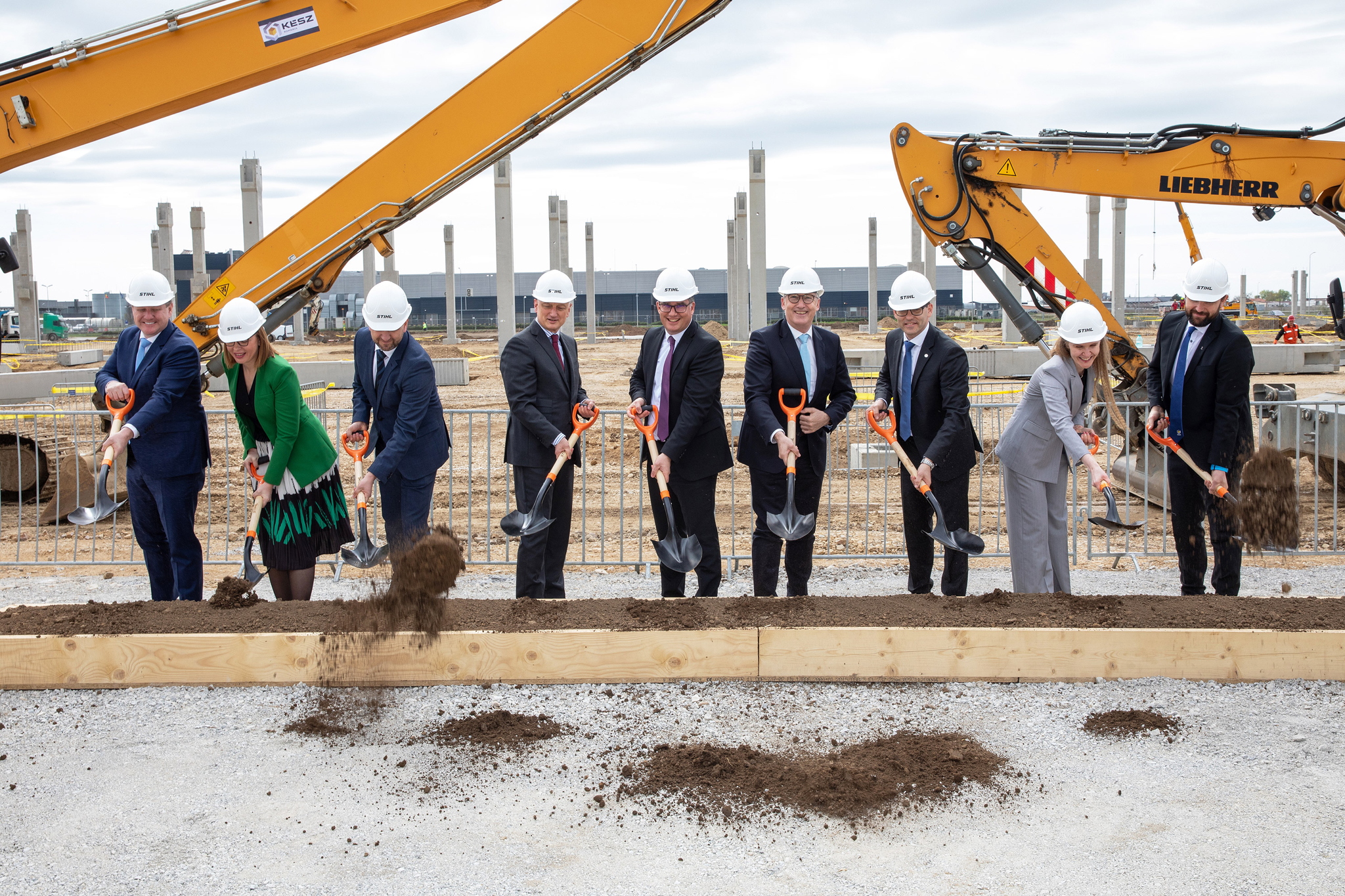 Symbolic groundbreaking ceremony for a new battery production facility in Romania: people standing in the picture with the shovels on their hands from the left: Michael Traub, STIHL Executive Board Chairman, Alina Silaghi, General Director ADLO, Florin Birta, Mayor of Oradea City, Dr. Nikolas Stihl, Chairman of the STIHL Advisory Board, Martin Schwarz, STIHL Executive Board Member Manufacturing und (and) Materials, Dr. Michael Prochaska, STIHL Executive Board Member Human Resources and Legal Affairs, Dr. Robert Feulner, Managing Director ANDREAS STIHL POWER TOOLS S.R.L. Romania, Noemi Straub, Vice President Finance, Legal & IT, Administrator ANDREAS STIHL POWER TOOLS S.R.L. Romania and Attila Puskás, Contracting Director Kész Romania.