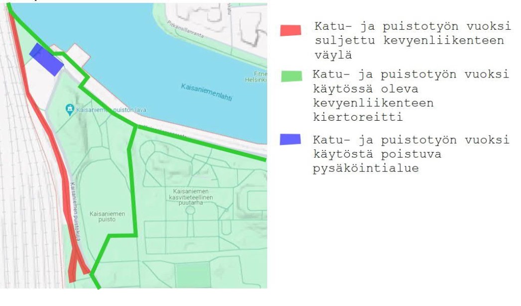 Kaisaniemenpuiston perusparannuksen vaiheen 3 yhteydessä tehdään huhtikuussa liikennejärjestelyjä, jotka vaikuttavat kevyenliikenteen kulkureitteihin alueella. Kaisaniemen puistokujalla ja Kaisaniemen rannalla tehdään kadun perusparannusta uusimalla pyörätiet ja rakentamalla kivetysalueita, vesihuoltoa, valaistustöitä ja vihertöitä.